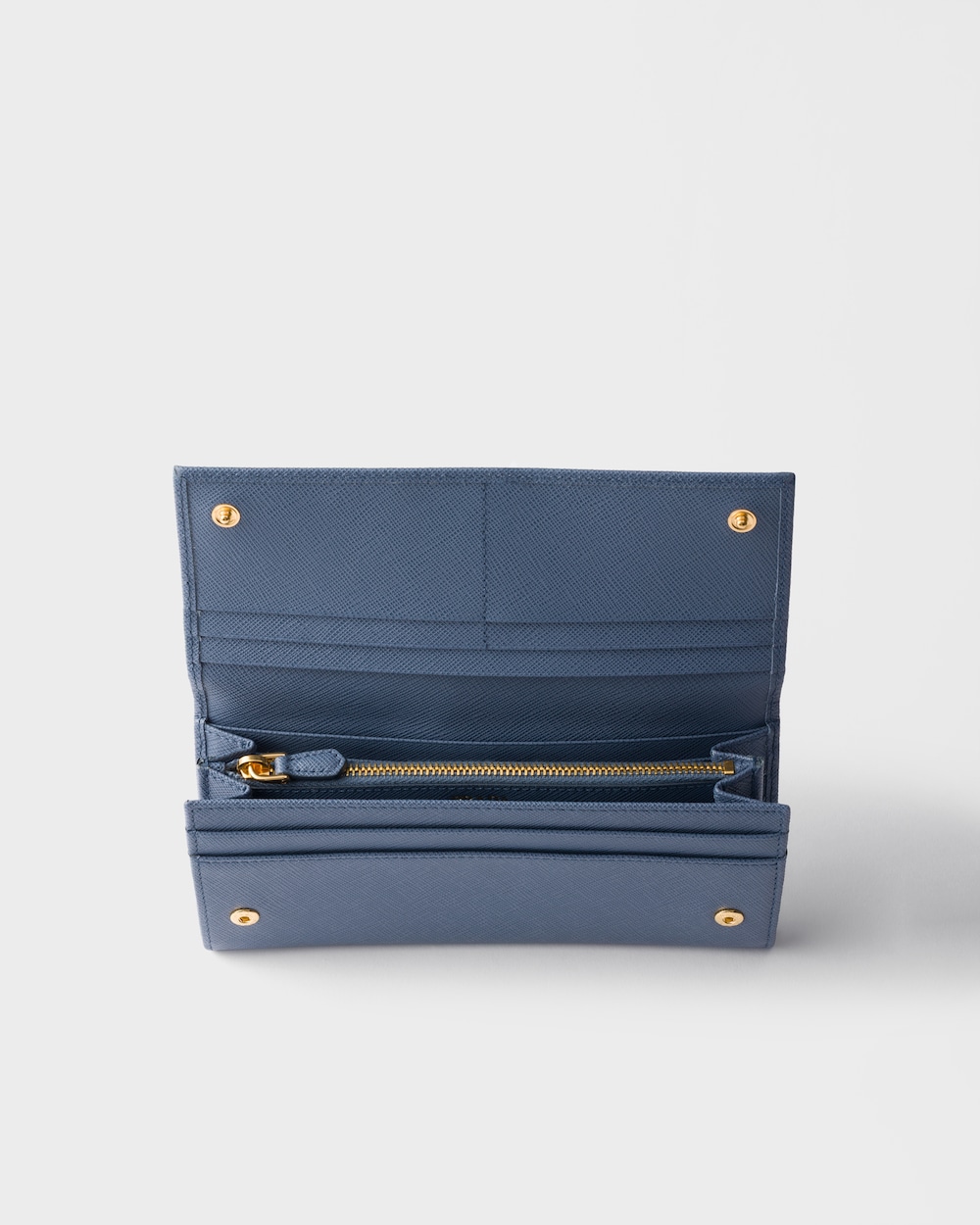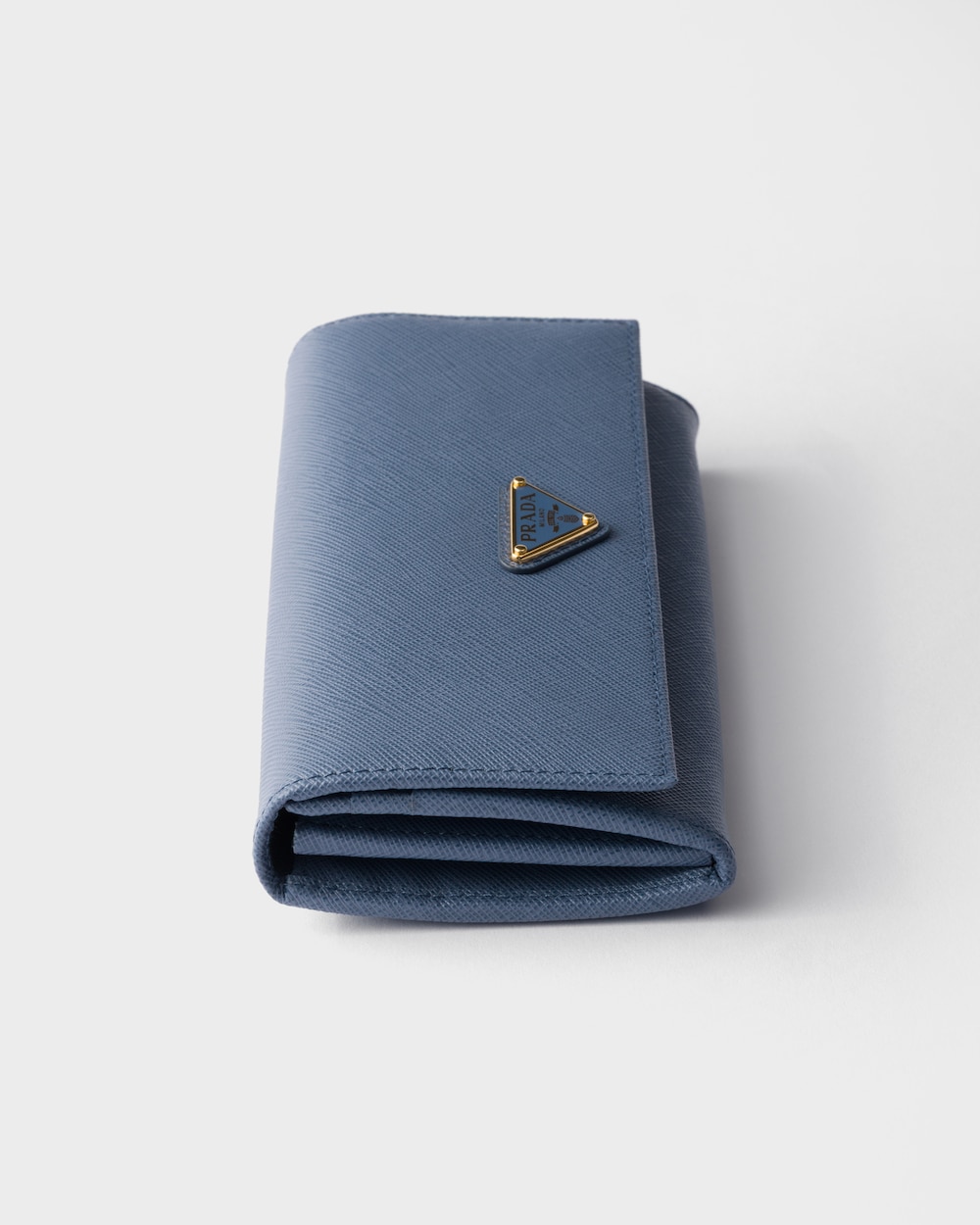 プラダのトライアングルロゴをあしらった、「サフィアーノ」レザー(牛革)のフラップ付の財布。スナップ開閉式を施し、複数のカードホルダーとポケットを配しました。