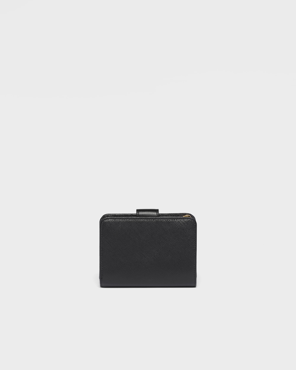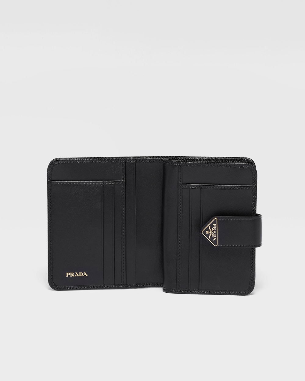 機能的な「サフィアーノ」レザー(牛革)の財布。エナメル トライアングルロゴがあしらわれたスナップ開閉式のデザイン。