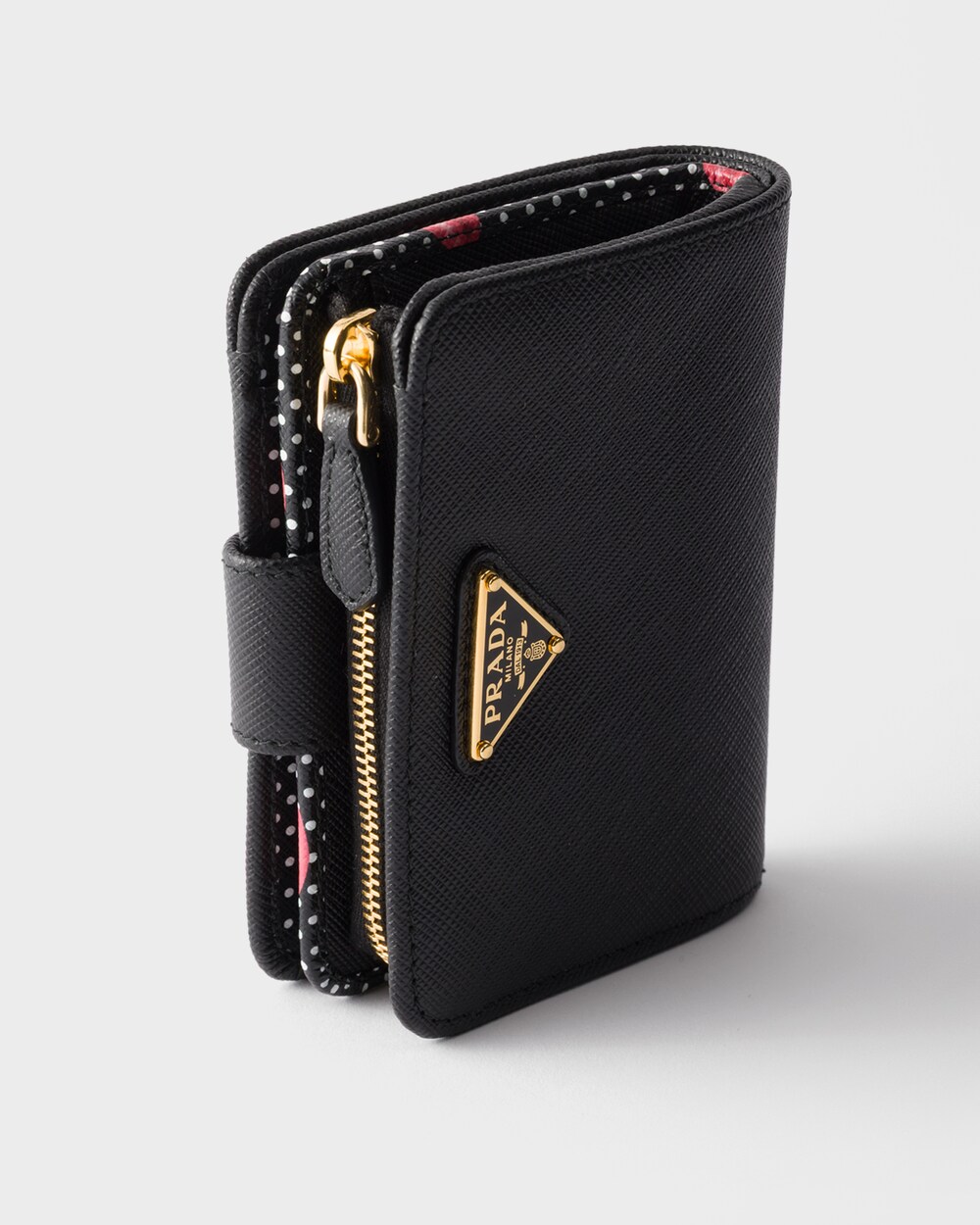 プラダのエレガンスが形となった、上質なサフィアーノレザー(牛革)で作られた小さな財布。アクセサリーには、ドキュメントポケットが複数、カードホルダー、札入れが備わっています。アクセサリーのデザインをメタルのトライアングルロゴが飾り、内側にはアイコニックなリッププリントが施され、ポップな印象を添えています。