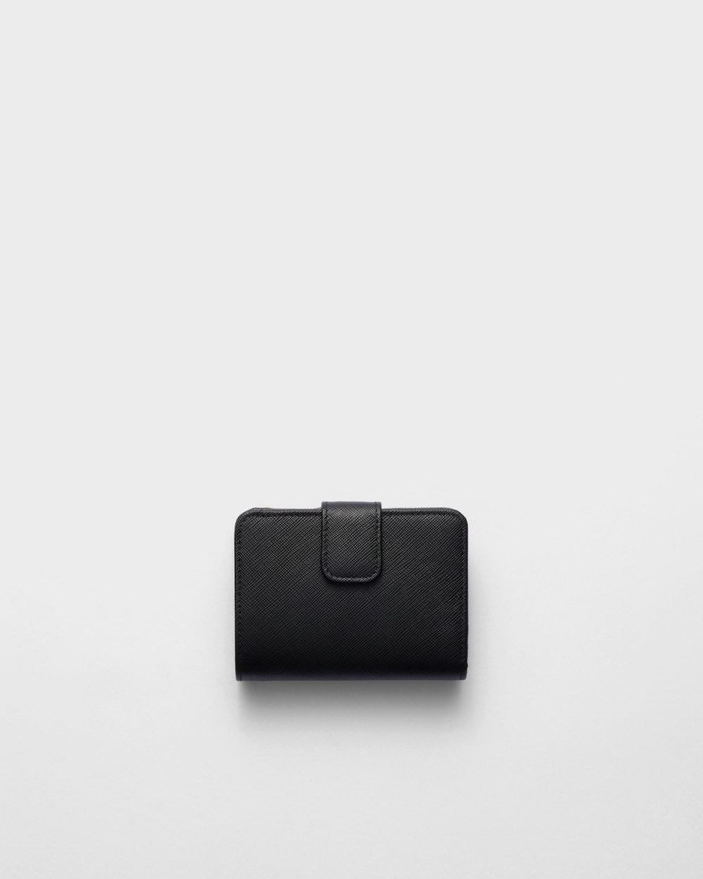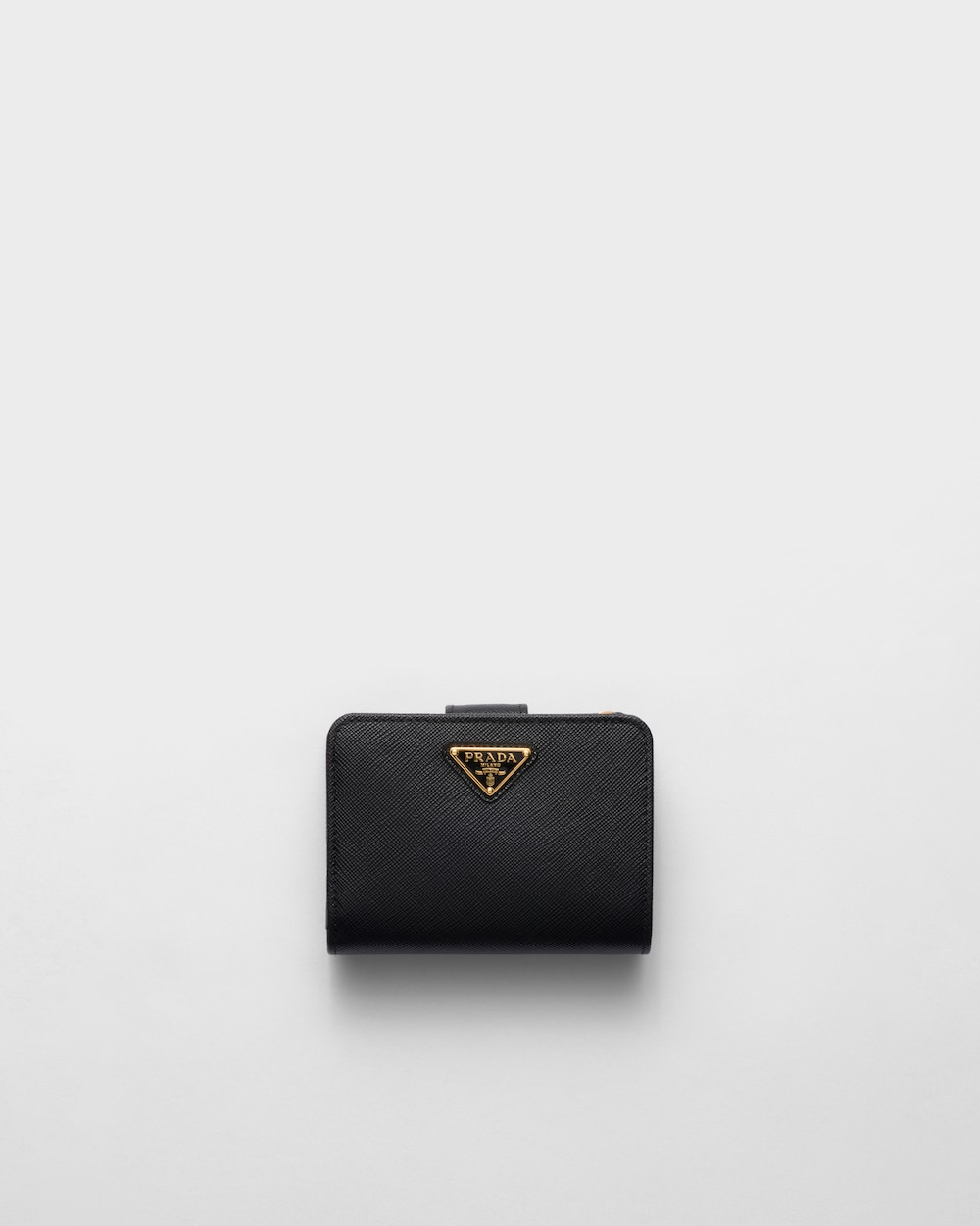 コンパクトなサイズながら高い機能性を備えた「サフィアーノ」レザー(牛革)の財布。スナップ開閉式。カードホルダー9個、内ポケット2個を備え、エナメルトライアングルロゴがあしらわれています。