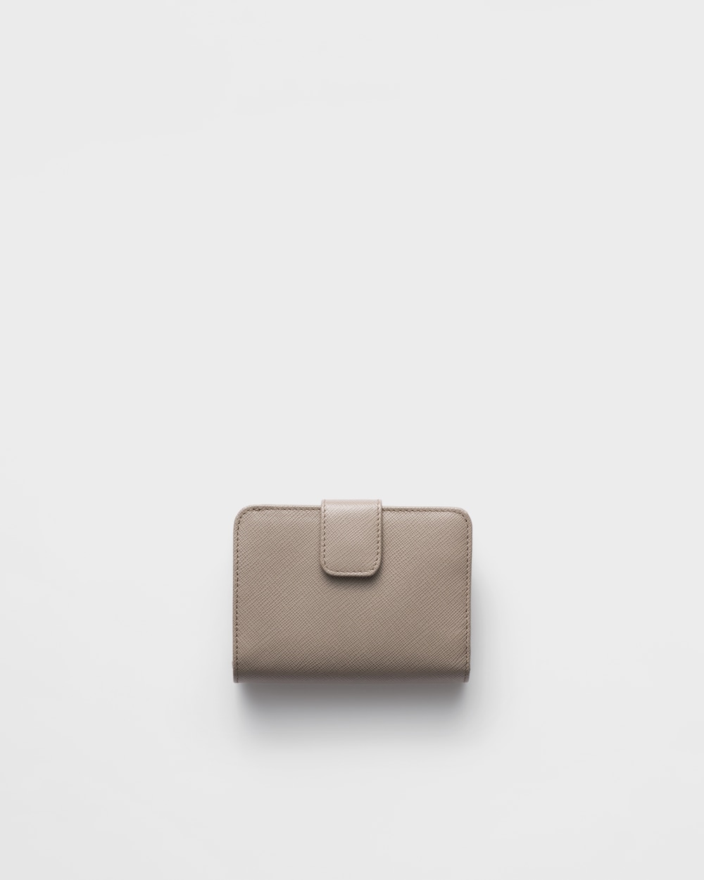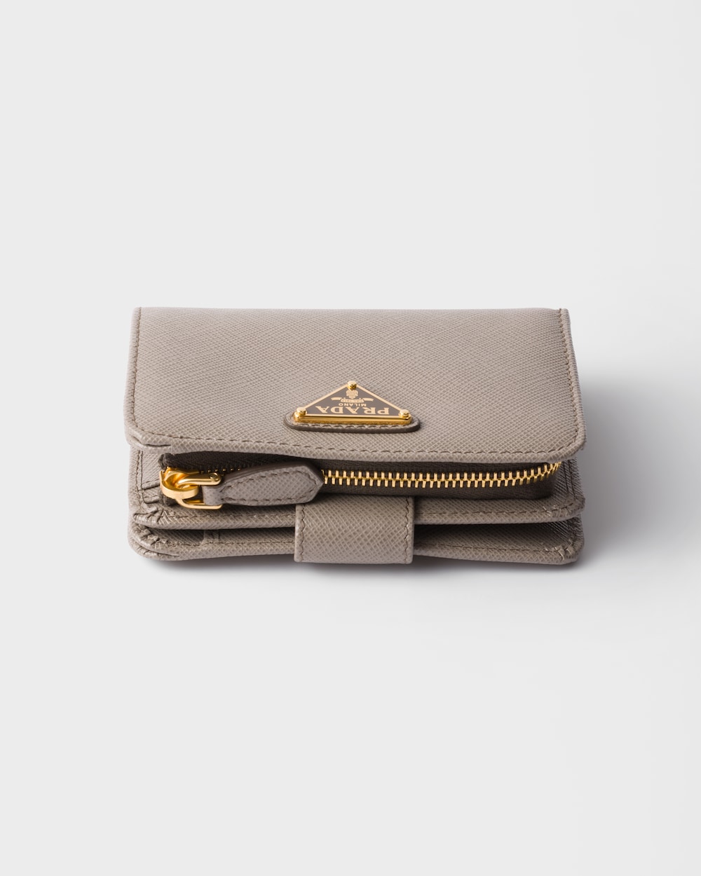 コンパクトなサイズながら高い機能性を備えた「サフィアーノ」レザー(牛革)の財布。スナップ開閉式。カードホルダー9個、内ポケット2個を備え、エナメルトライアングルロゴがあしらわれています。