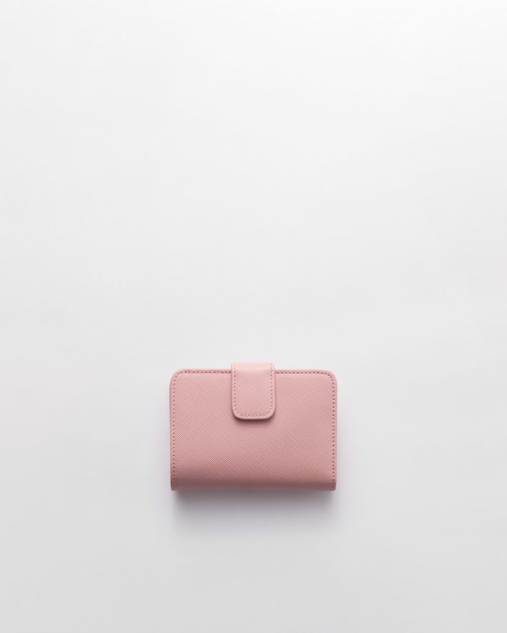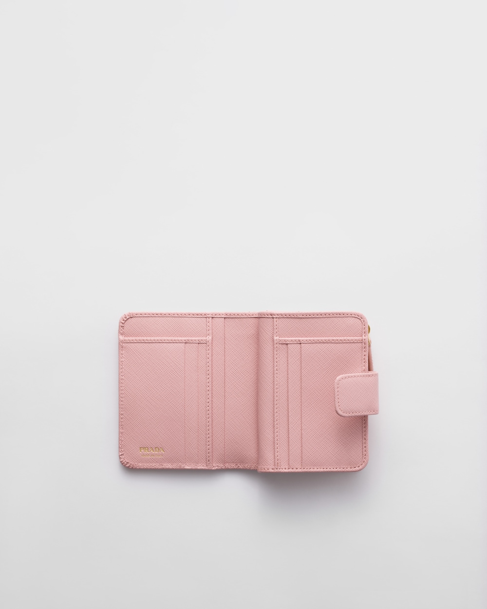 コンパクトなサイズながら高い機能性を備えた「サフィアーノ」レザー(牛革)の財布。スナップ開閉式。カードホルダー9個、内ポケット2個を備え、エナメルトライアングルロゴがあしらわれています。