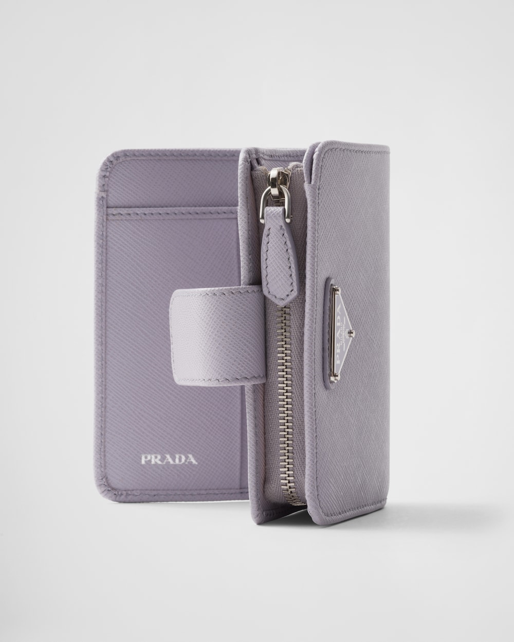コンパクトなサイズながら高い機能性を備えた「サフィアーノ」レザー(牛革)の財布。スナップ開閉式。カードホルダー9個、内ポケット2個を備え、エナメルトライアングルロゴがあしらわれています。