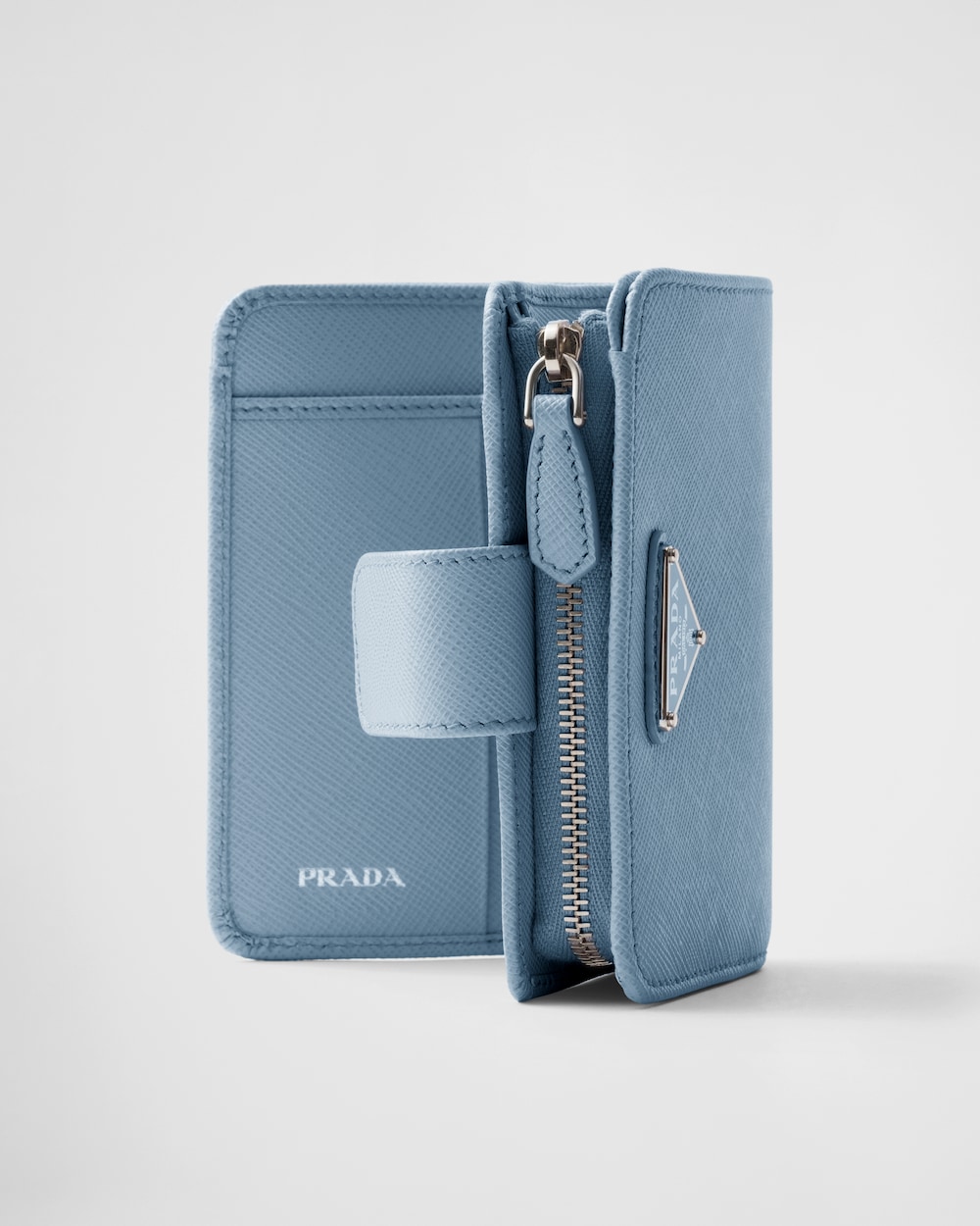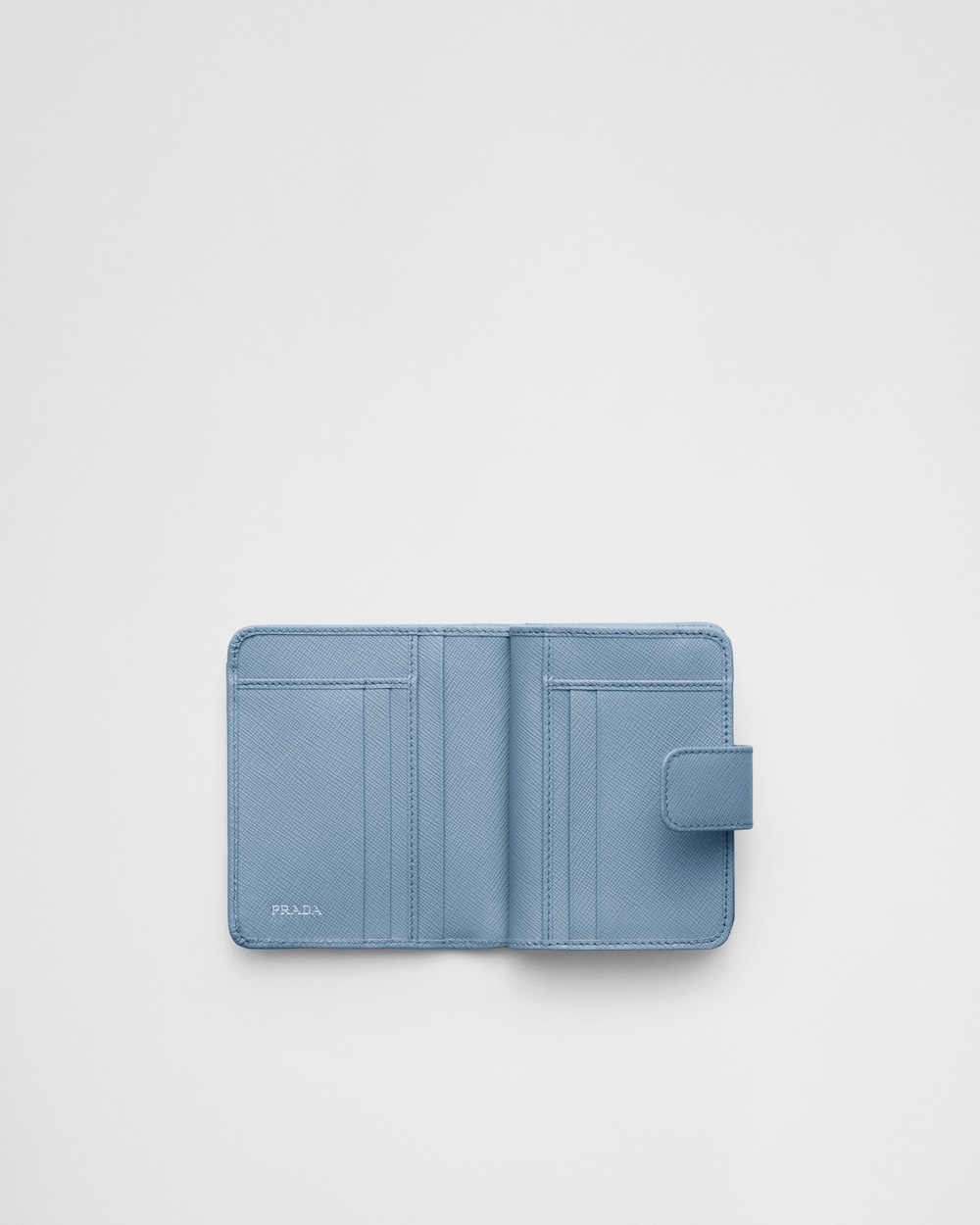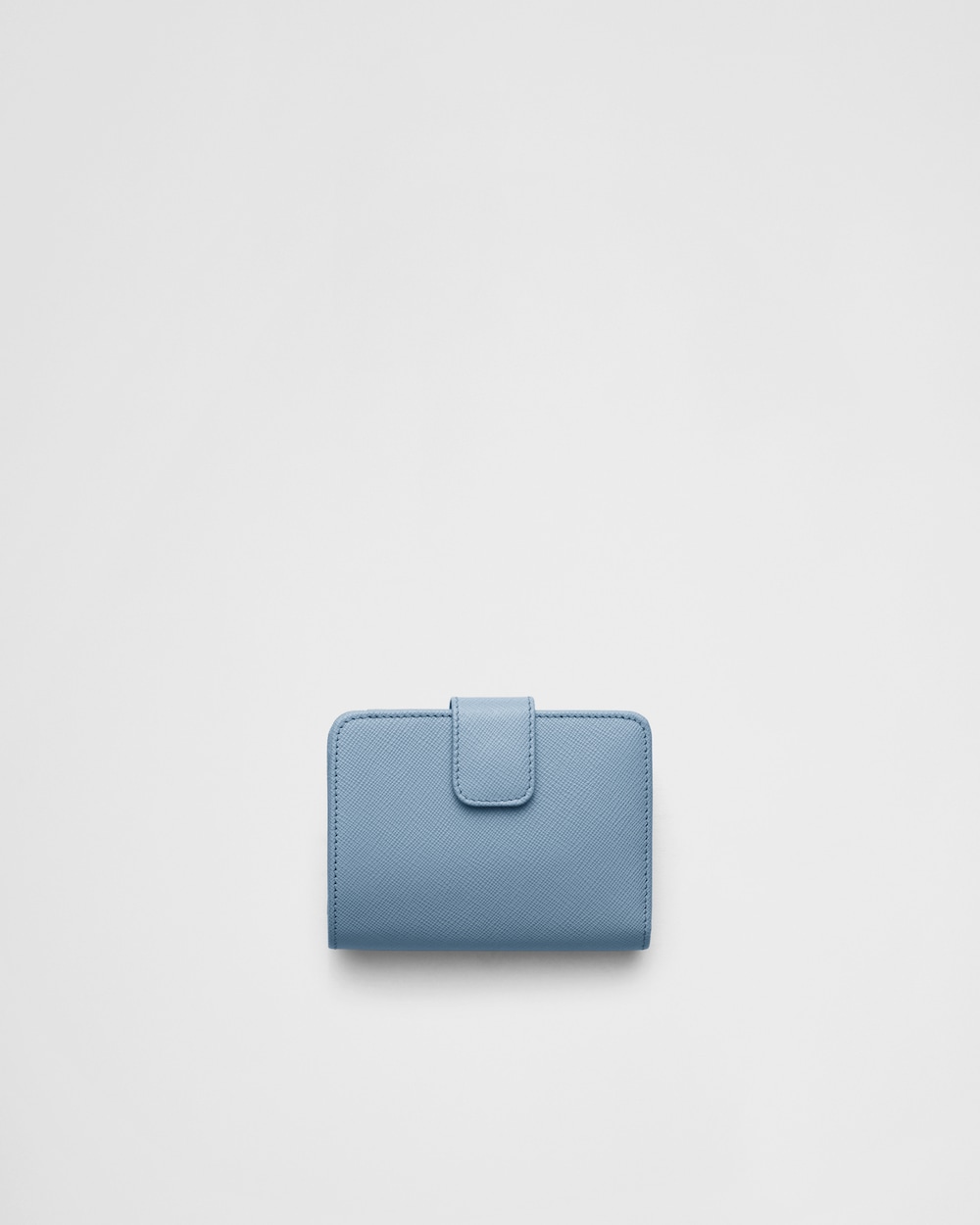 コンパクトなサイズながら高い機能性を備えた「サフィアーノ」レザー(牛革)の財布。スナップ開閉式。カードホルダー9個、内ポケット2個を備え、エナメルトライアングルロゴがあしらわれています。