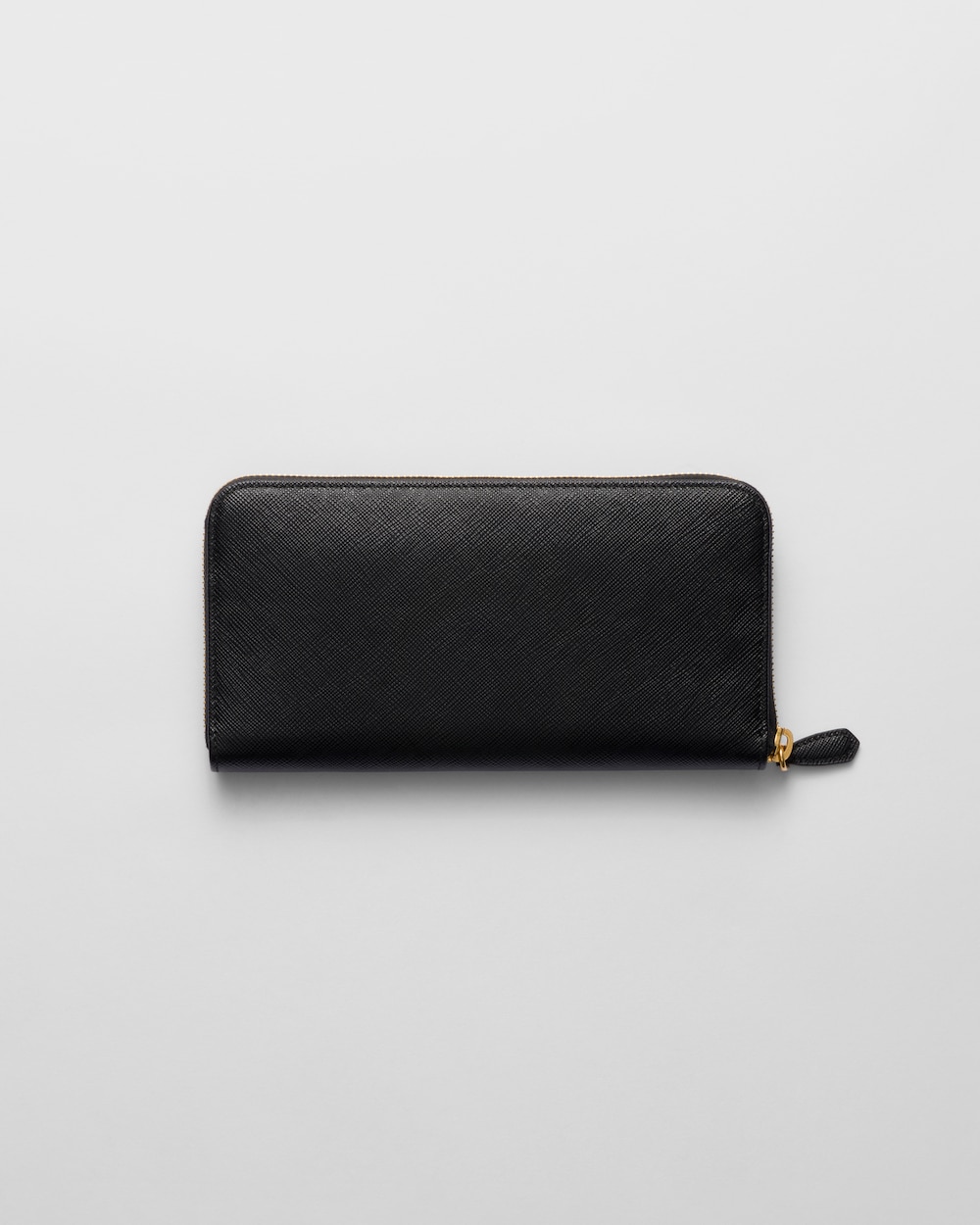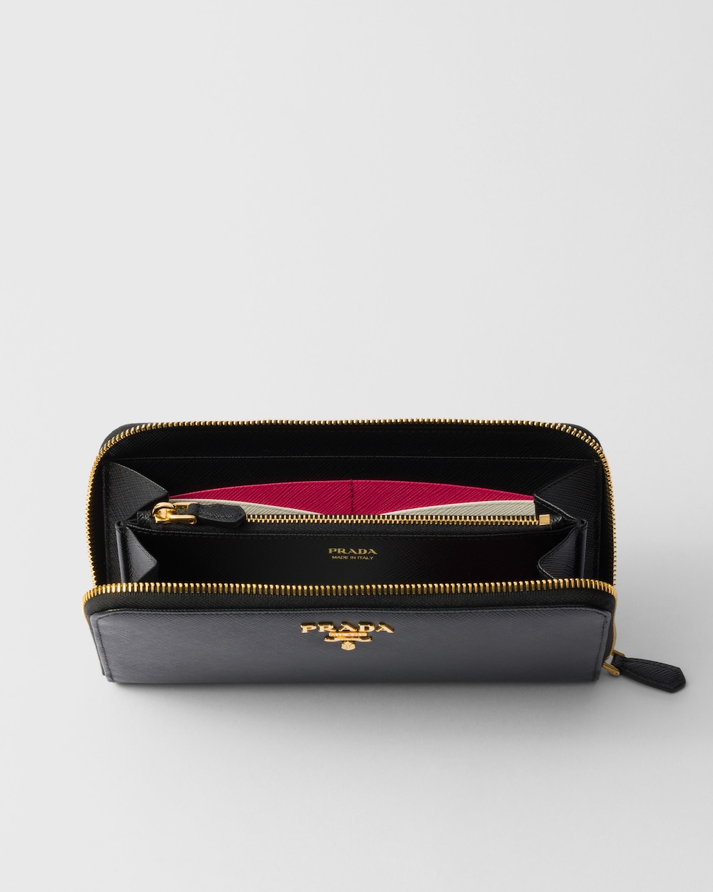 プラダを象徴する素材「サフィアーノ」レザーを使用し、内側にはコントラストの効いたマルチカラーのデザインに仕上げたジップアラウンドの長財布。高品質のカーフレザーにクロスハッチ加工とワックス仕上げを施した「サフィアーノ」レザーの質感をお楽しみいただけるアイテム。アクセントとしてレタリングロゴがあしらわれています。
