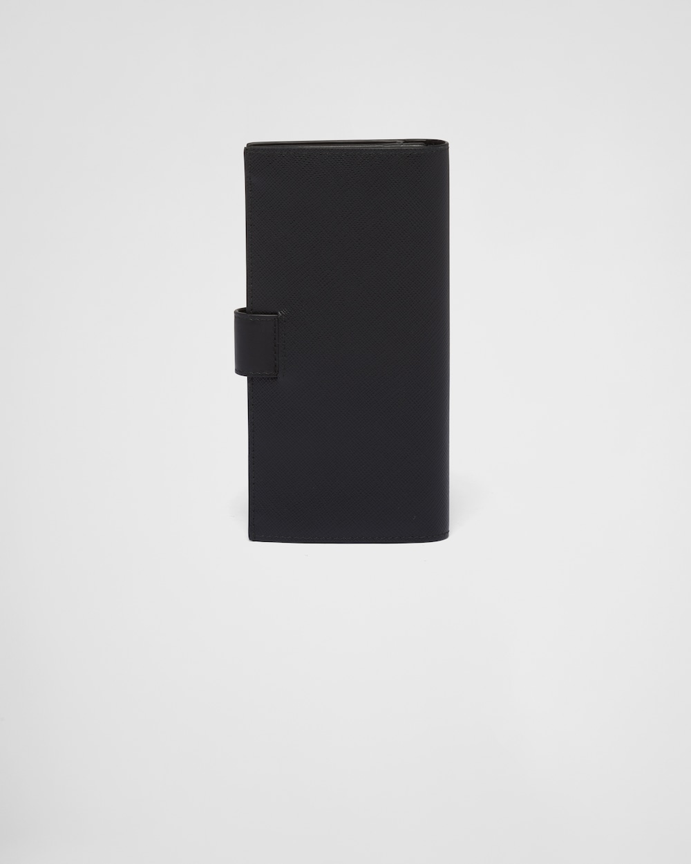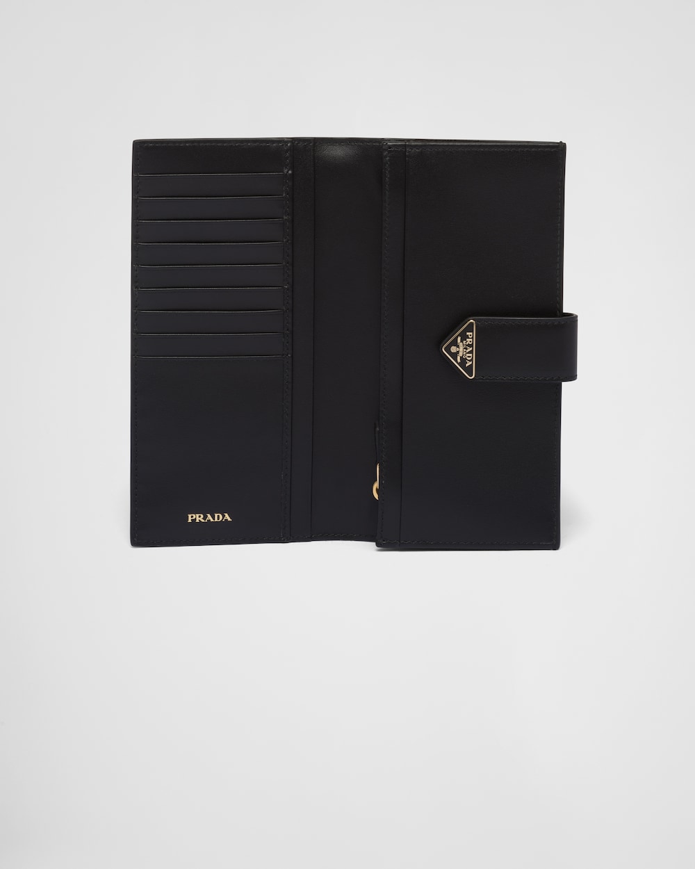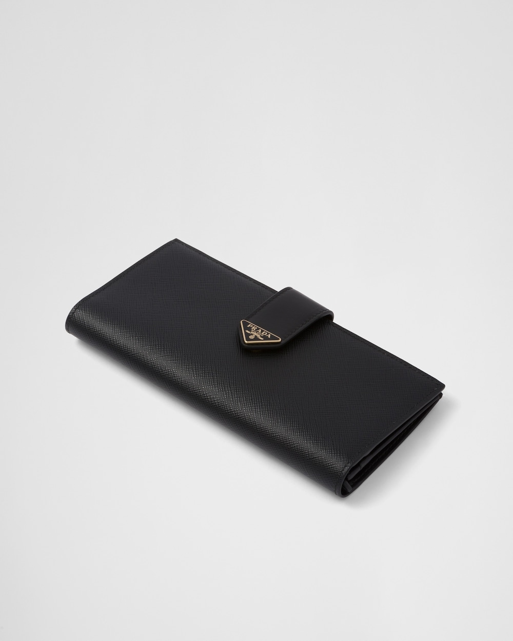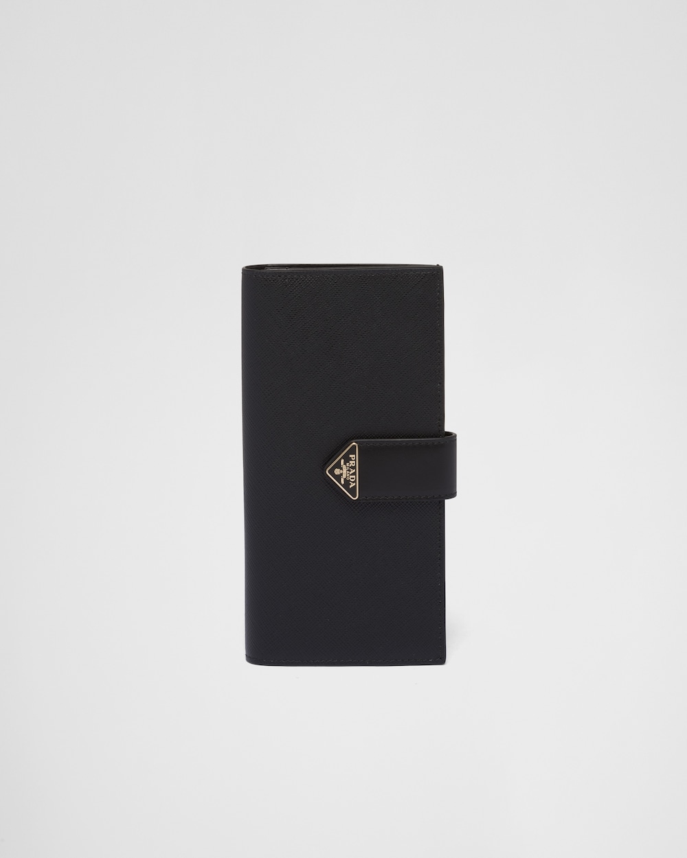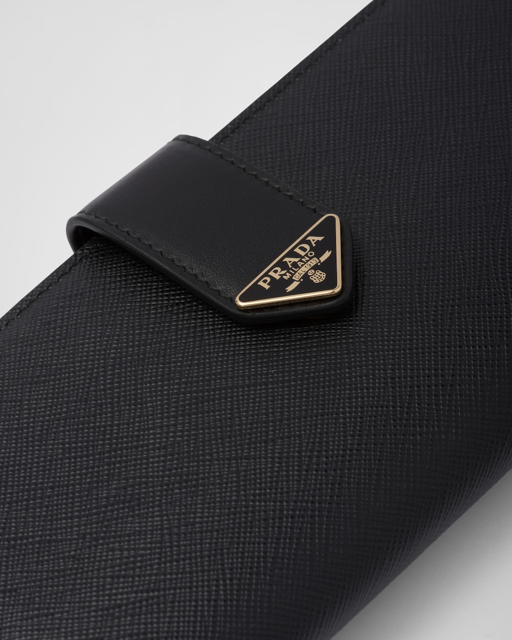 スムースレザーとプラダを象徴する素材であるクロスハッチ加工をほどこした「サフィアーノ」レザー(牛革)を組み合わせた異なる質感が楽しめる、洗練された印象の財布。複数の収納部分やポケットを備えたミニマルなデザインに、ブランドを象徴するエナメル トライアングルロゴをあしらったアクセサリー。