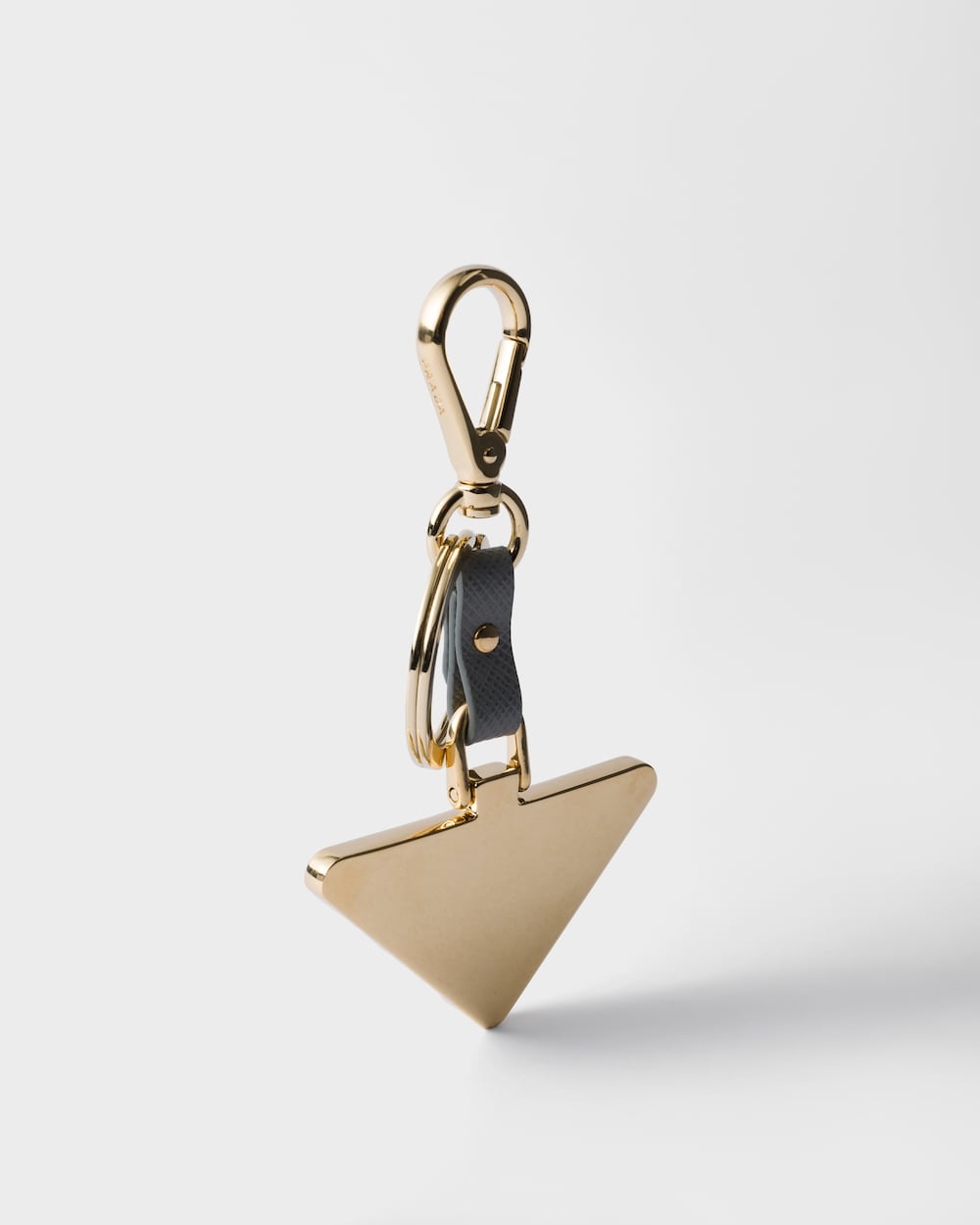 メタルのディテールとアイコニックなプラダのトライアングルロゴのようなシェイプが特徴的な「サフィアーノ」レザーのキーリング。