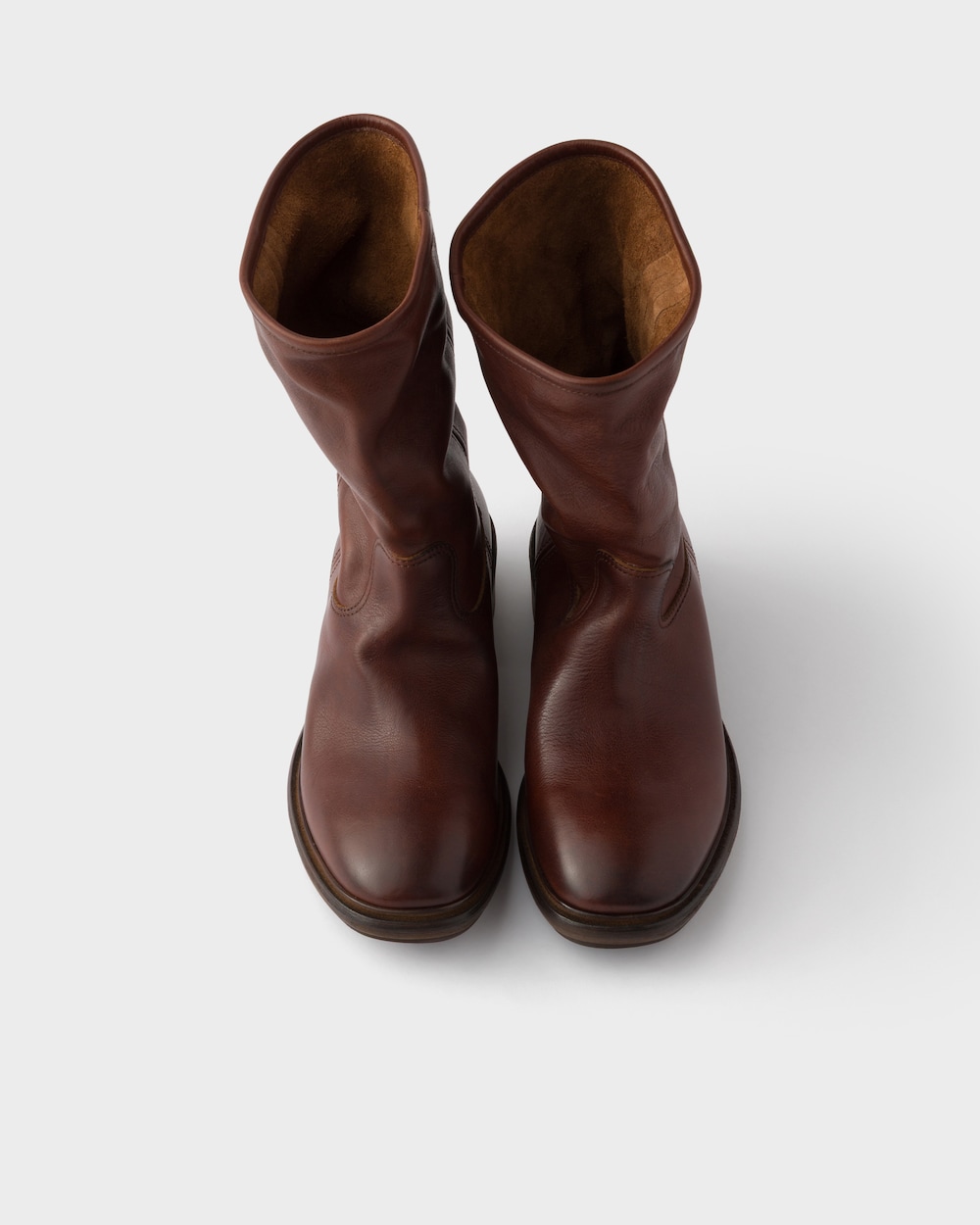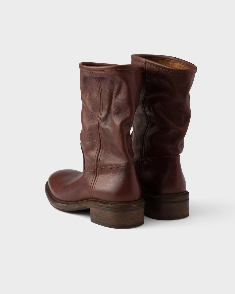 これらの大胆なミッドカーフブーツは、ヴィンテージ風のディテールを備えた柔らかなデコンストラクテッド構造が特徴です。ブーツは、職人技で加工されたレザーを使用し、自然なエイジング効果を持たせています。これは、着用者のアイデンティティを真に表現するものです。