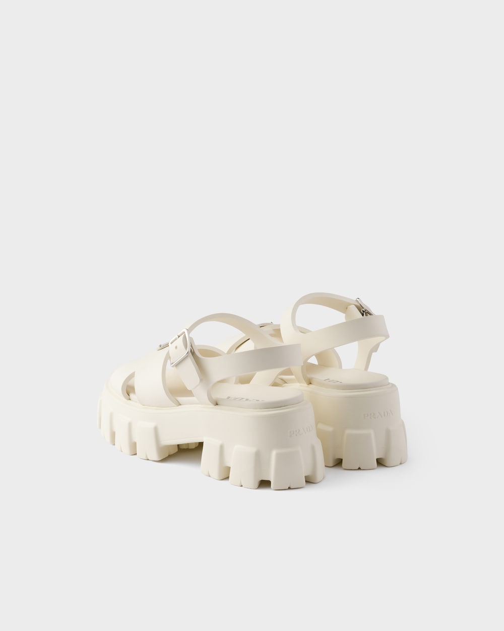 プラダの斬新な二元性の精神を象徴する、スポーティなアクセントと現代的なディテールが際立つラバーのサンダル。個性的なモノリスソールを特徴とするスタイルを、アイコニックな魅力を放つエナメルメタルのトライアングルロゴで仕上げました。
