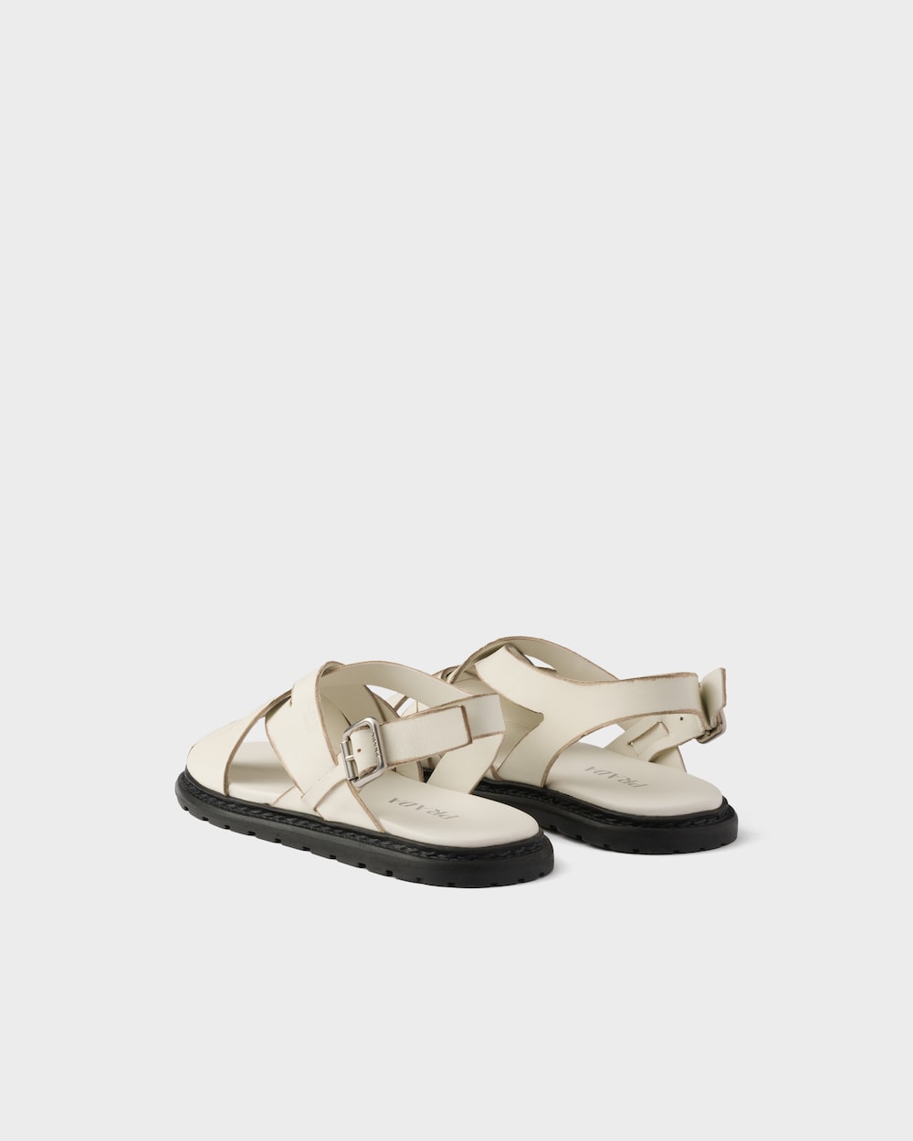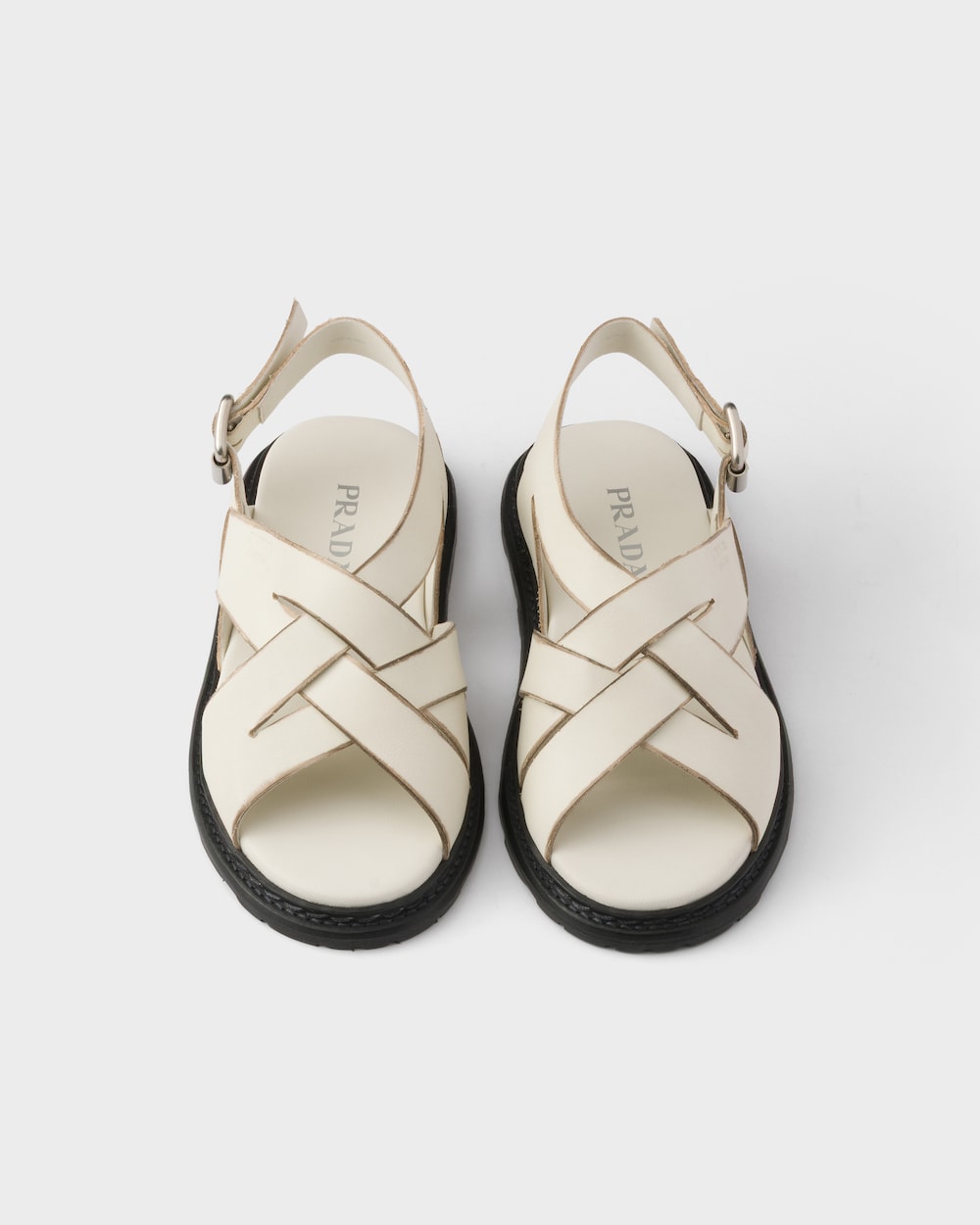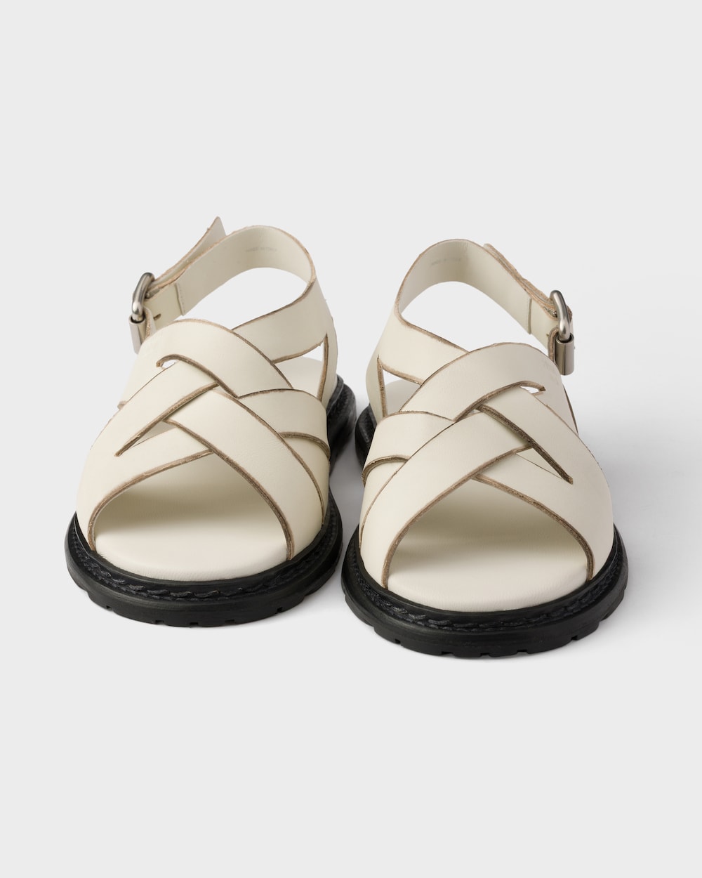 アンティーク加工レザーのクリスクロスデザインサンダル。レトロなインスピレーションとスポーティなディテールを組み合わせています。