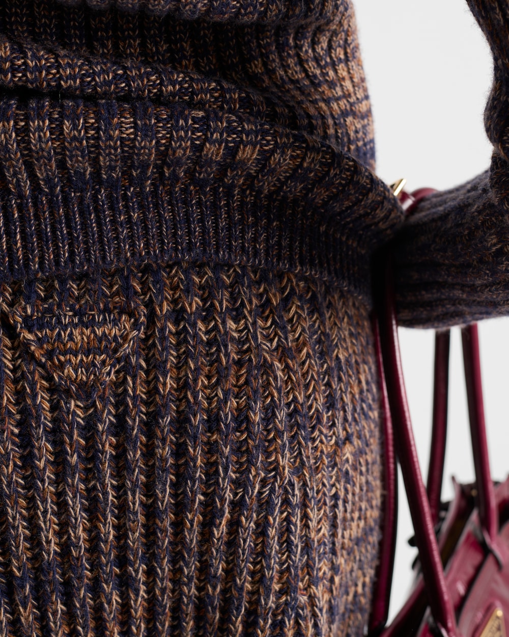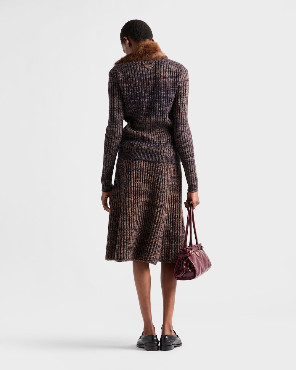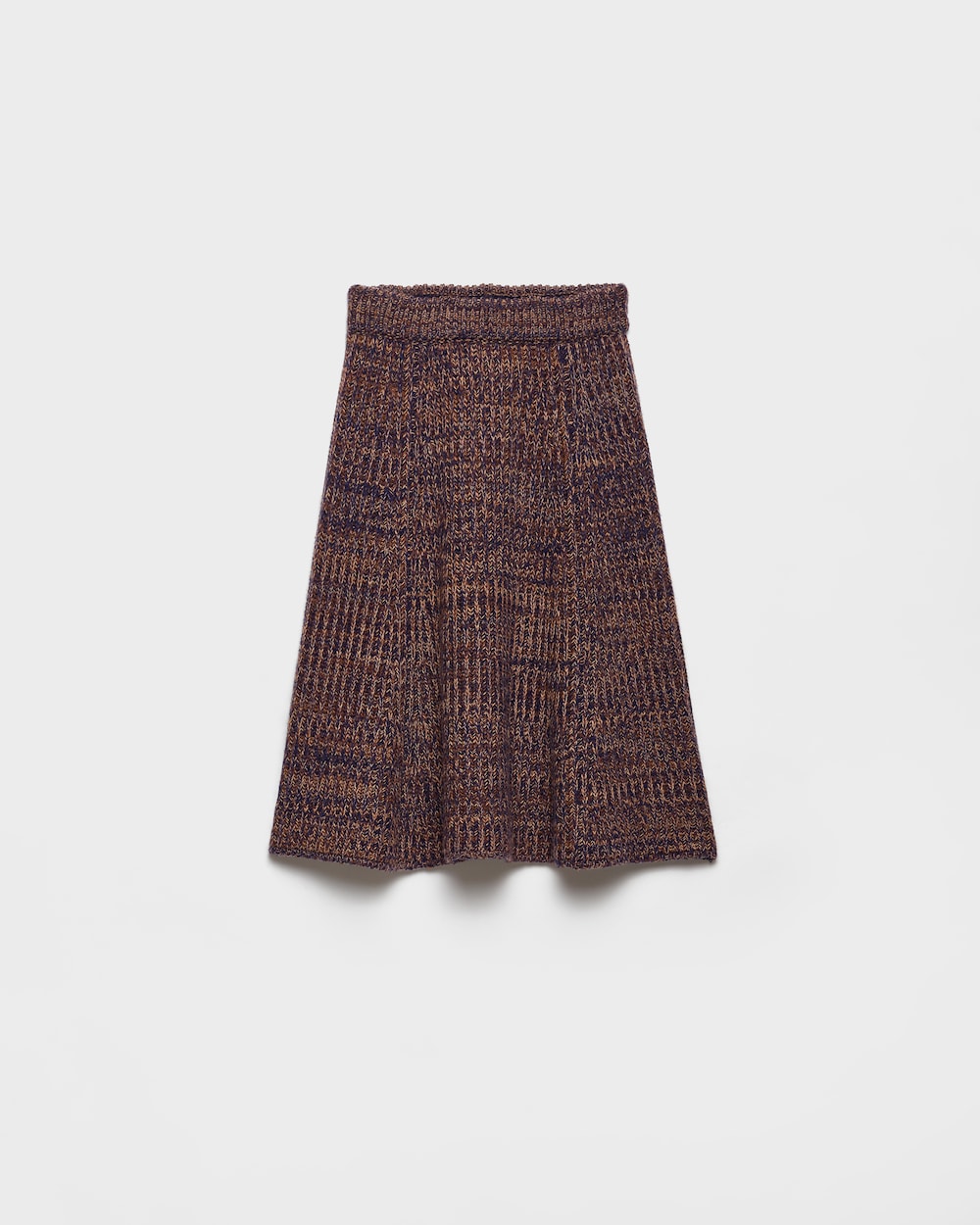 柔らかさと構築的なフォルムを兼ね備えたこのスカートは、洗練されたフレアシルエットが魅力です。上質なウールブレンドとカシミアブレンドで仕立てられ、リブ編みが豊かな質感を引き立てます。仕上げには同色のトライアングルロゴがあしらわれ、控えめながらも印象的なアクセントを添えています。