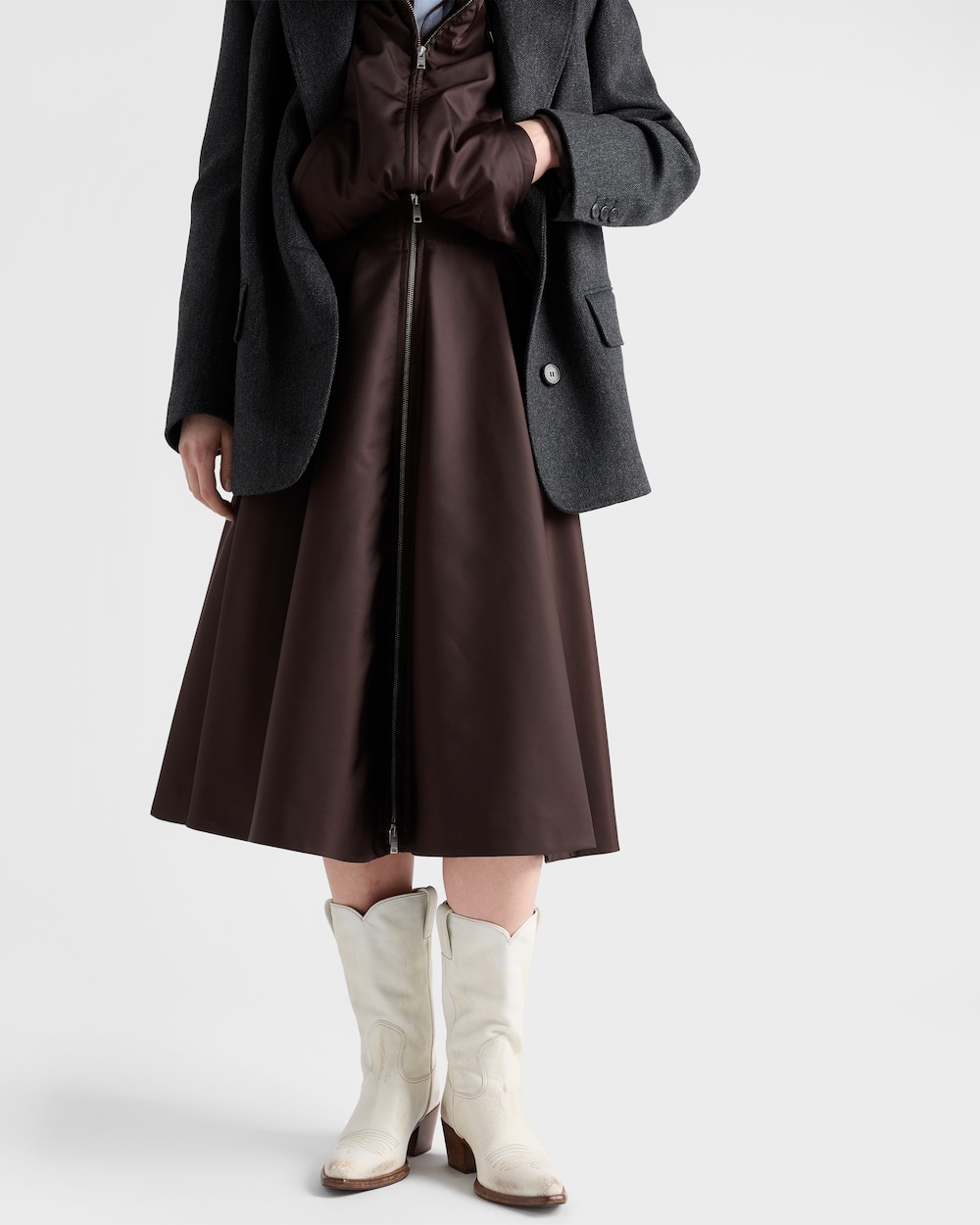 実用的でライトなRe-Nylonがスポーティなアクセントを添える、プラダコレクションのアイコニックなスタイルであるサークルスカート。ハイウエストとふんわりとしたラインが特徴で、ジッパークロージャーとニットディテールで仕上げられています。 サスティナブルなお手入れ方法:製品の風合いを保つため、また環境への負荷を軽減するために、製品を頻繁にクリーニングすることを推奨しておりません。使用後は風通しの良い場所で陰干ししていただき、クリーニングが必要な場合は環境に配慮したクリーニング店でドライクリーニングをすることをおすすめします