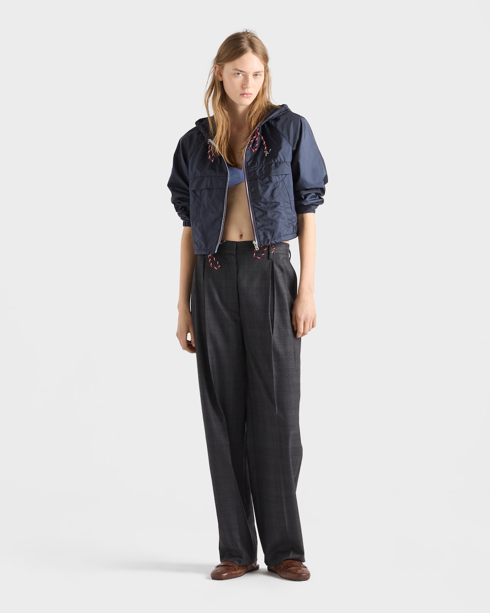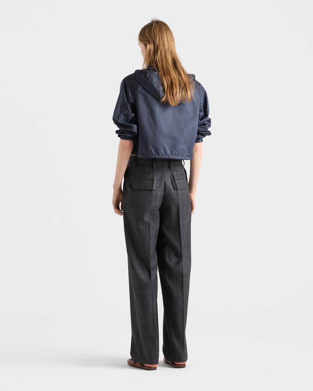革新的なRe-Nylonを使用したショートジャケットは、ライフスタイルセグメントにテックウェアを導入した現代のスポーツ界にインスパイアされています。このボックスシルエットは、1913年に創業者のマリオ・プラダがデザインしたトランクに初めて登場して以来、ブランドの象徴となっているエナメルメタルのトライアングルロゴで飾られています。