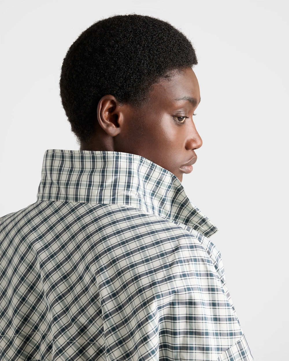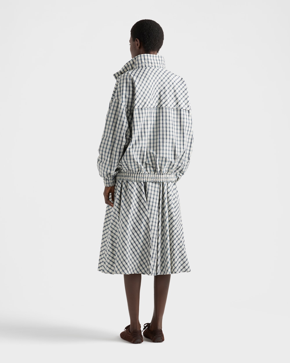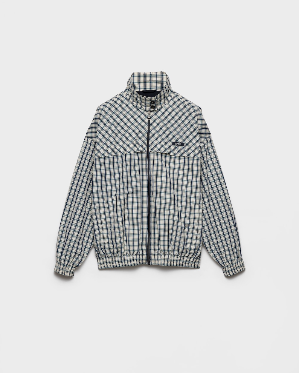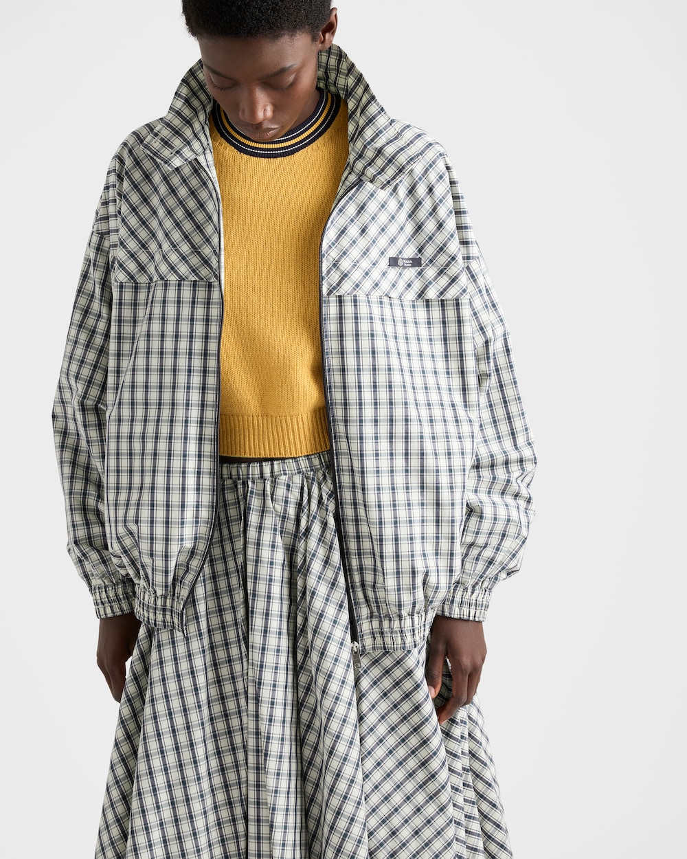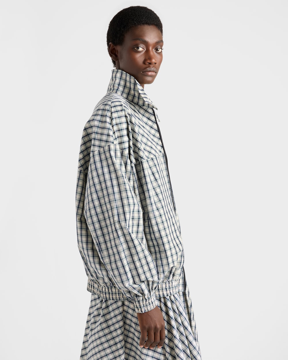 スポーティなシルエットと機能的なディテールを備えたこのブルゾンジャケットは、伝統的なテーラリングに見られるクラシックなチェック柄と組み合わされています。