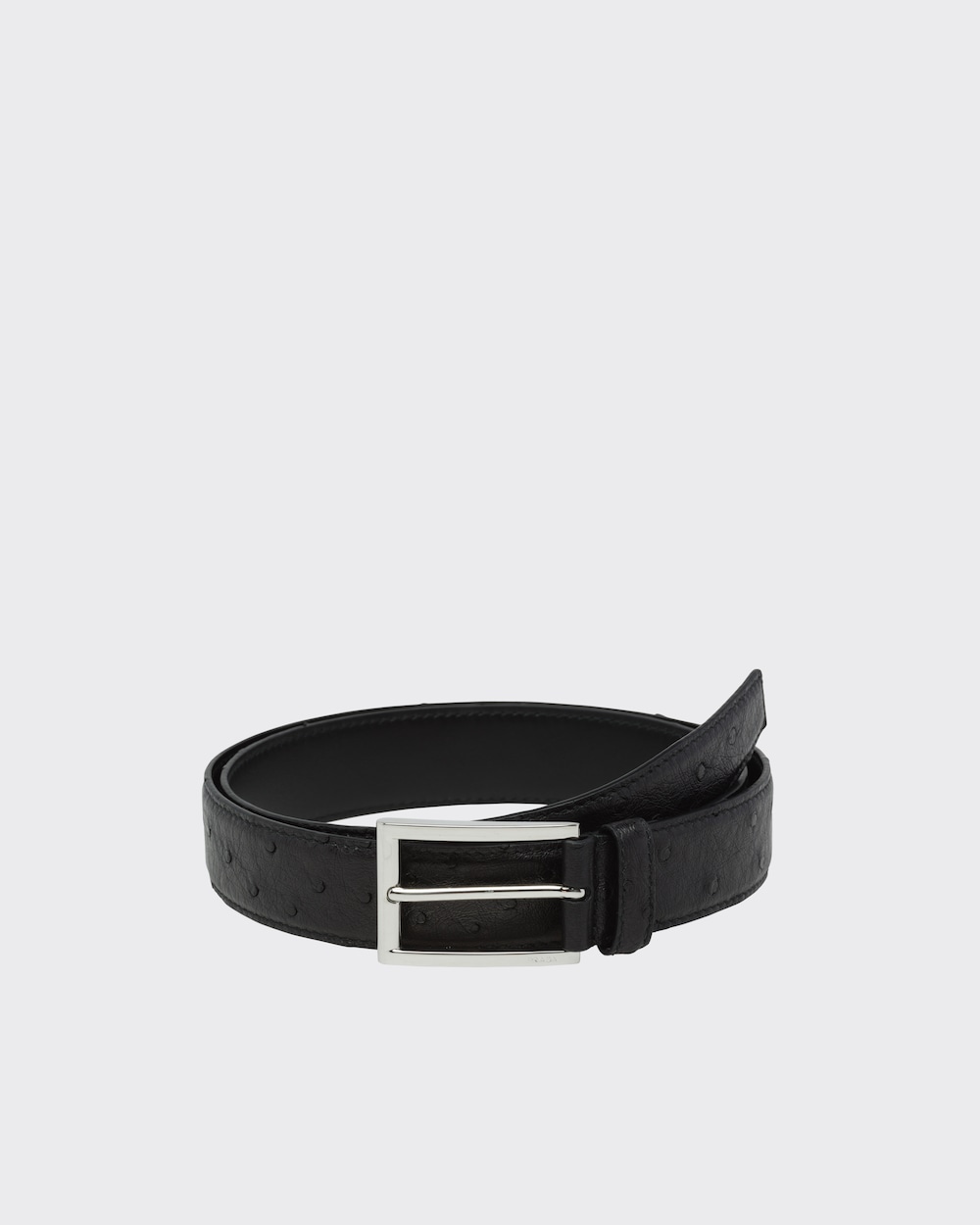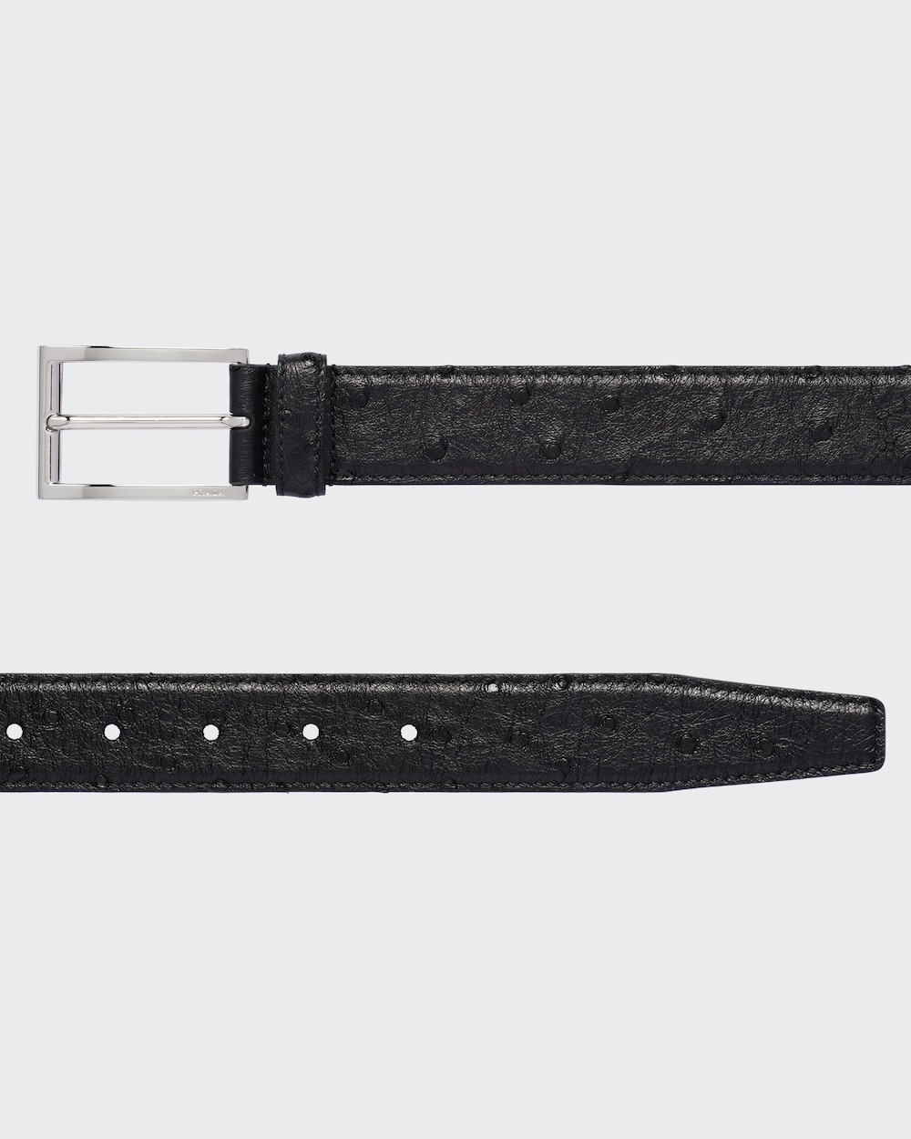 メタルバックルを備えたエレガントなデザインの上質なオーストリッチレザーベルト。