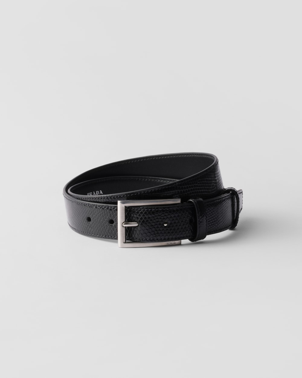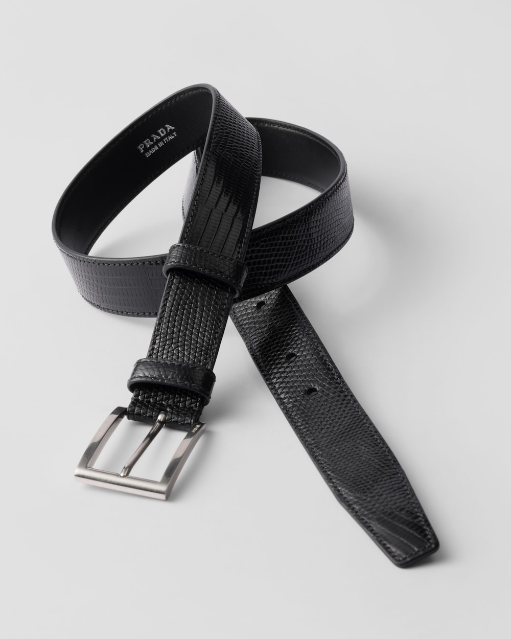 このベルトは、上質なリザードレザー(トカゲ革)を使用し、独特で洗練されたデザインに仕上げています。長方形のメタルバックルが、この上品なアクセサリーを完成させます。