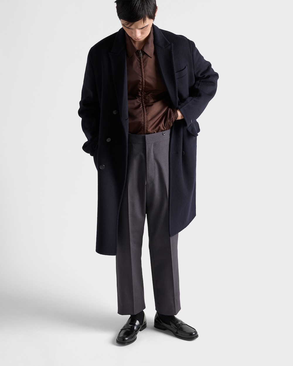 細長いラインが特徴のブラッシュドレザー(牛革)のローファー。時代錯誤の伝統を体現しながらも、手作業によるディテールがモダンな魅力を添えています。フロントには、1913年に創業者のマリオ・プラダがデザインしたトランクに初めて登場したエナメルメタルのトライアングルロゴがあしらわれています。