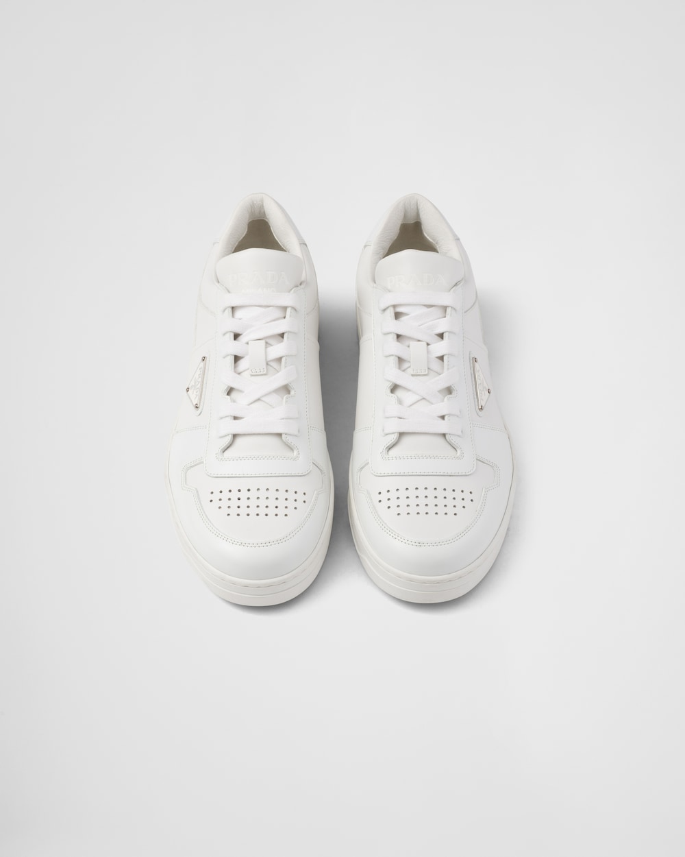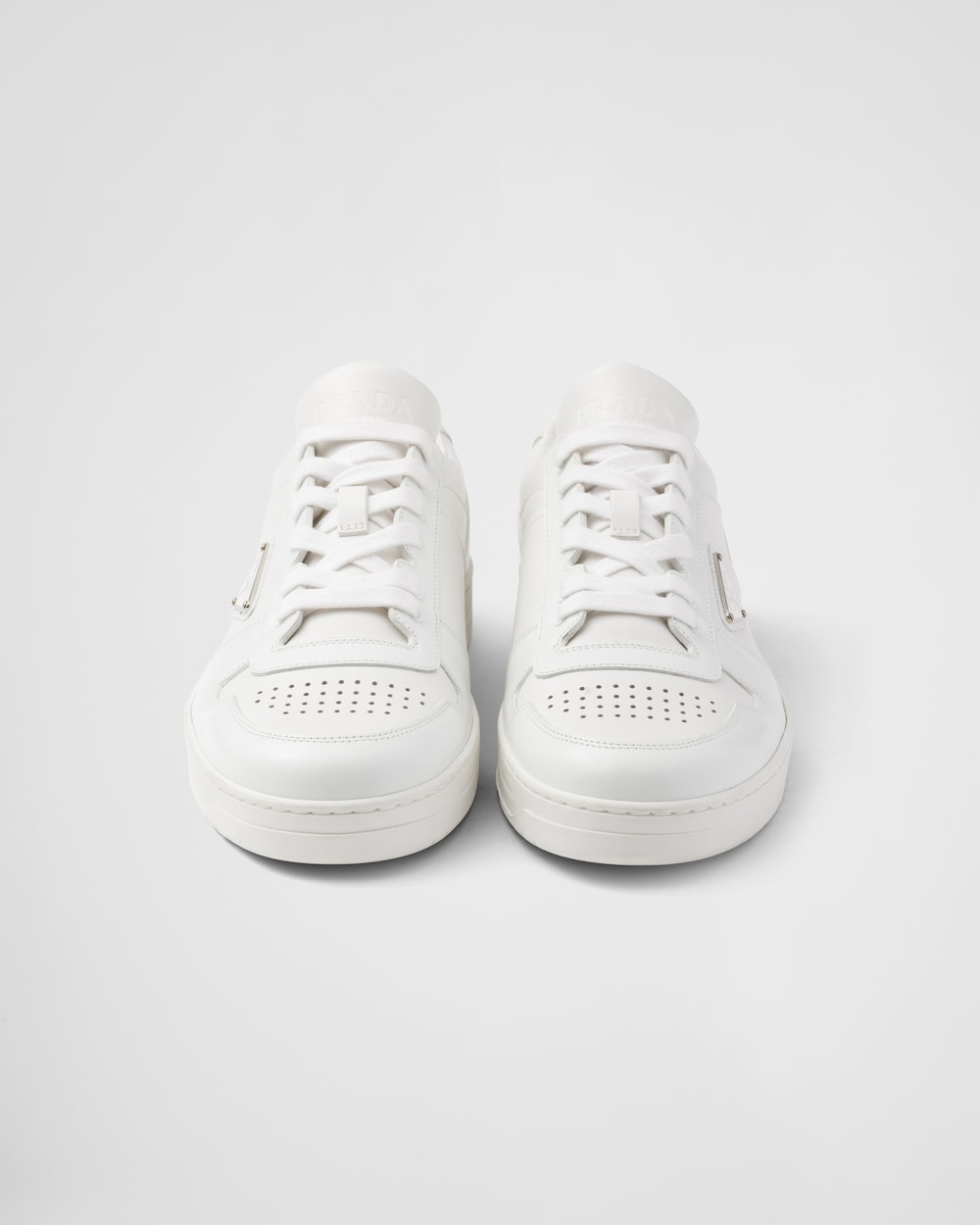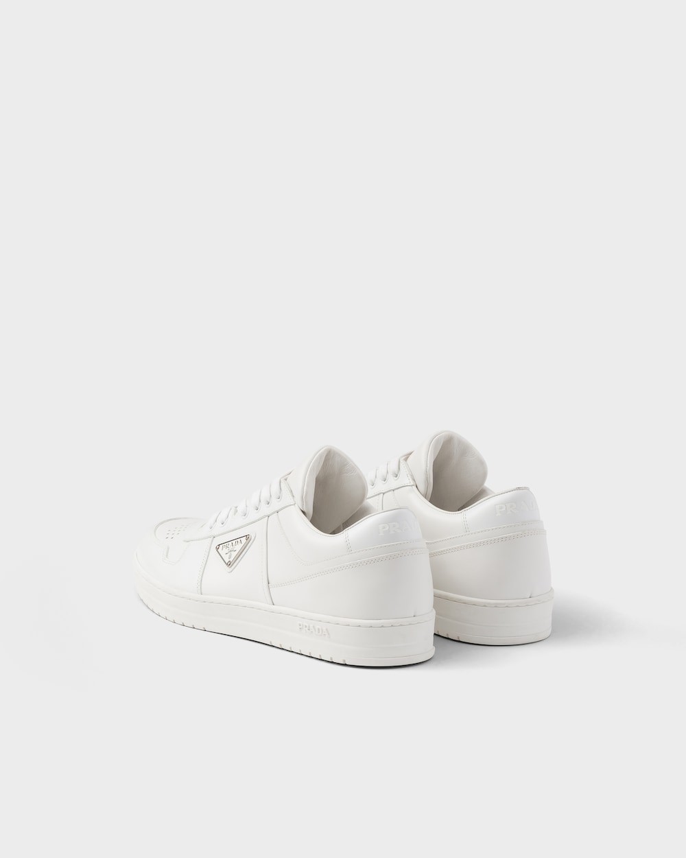 タンのプラダロゴや、アッパーのサイドのアイコニックなエナメルメタルのトライアングルなど、多様な解釈のロゴがアクセントになった、軽量ラバーソールのスポーティなレザースニーカー。