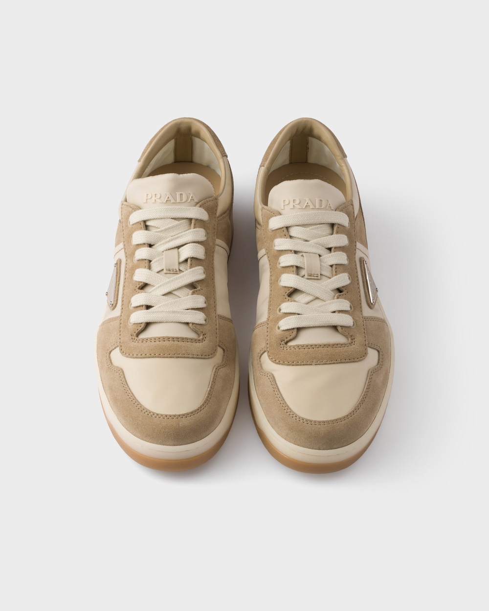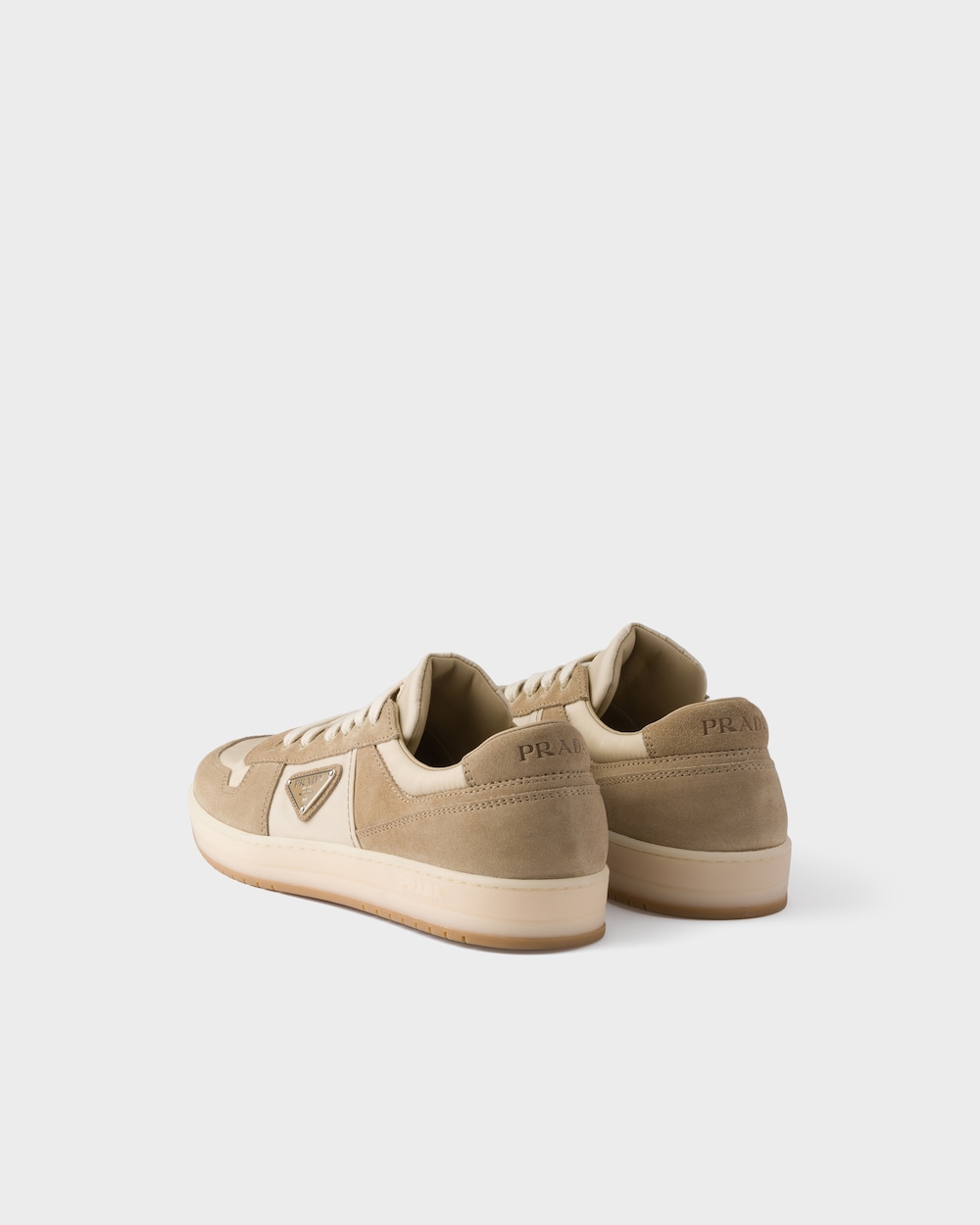 Re-Nylonとスエードを組み合わせた、現代的なデザインのプラダ ダウンタウンスニーカー。80年代のバスケットボールシューズにインスパイアされたスニーカーに、エナメルメタルのトライアングルロゴがあしらわれています。 この商品はSEA BEYOND 教育プロジェクト支援の対象商品ではありません。