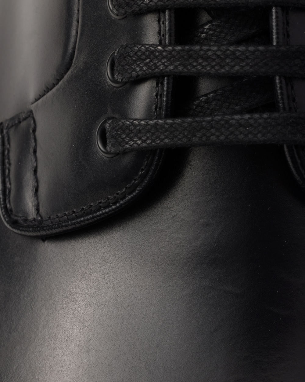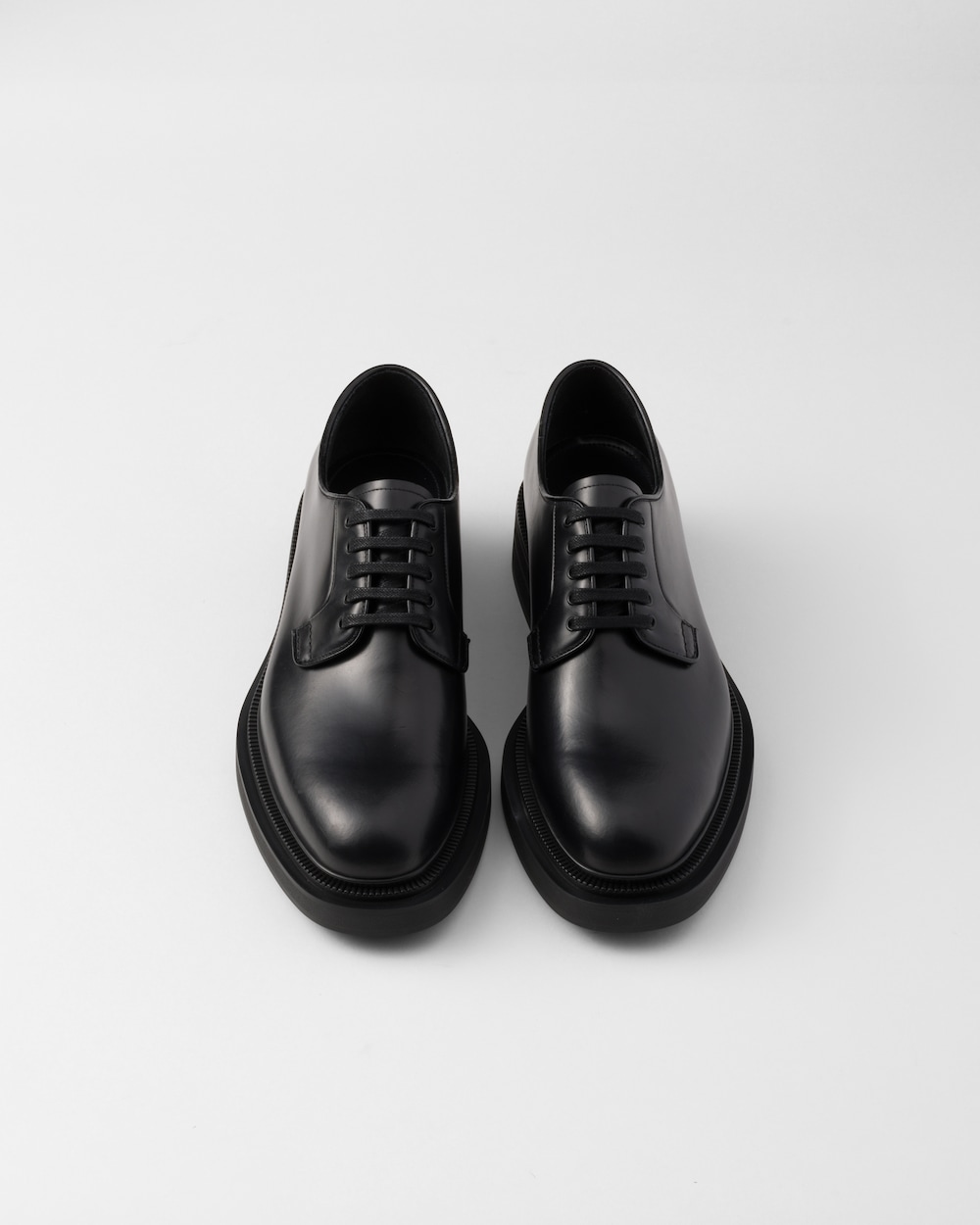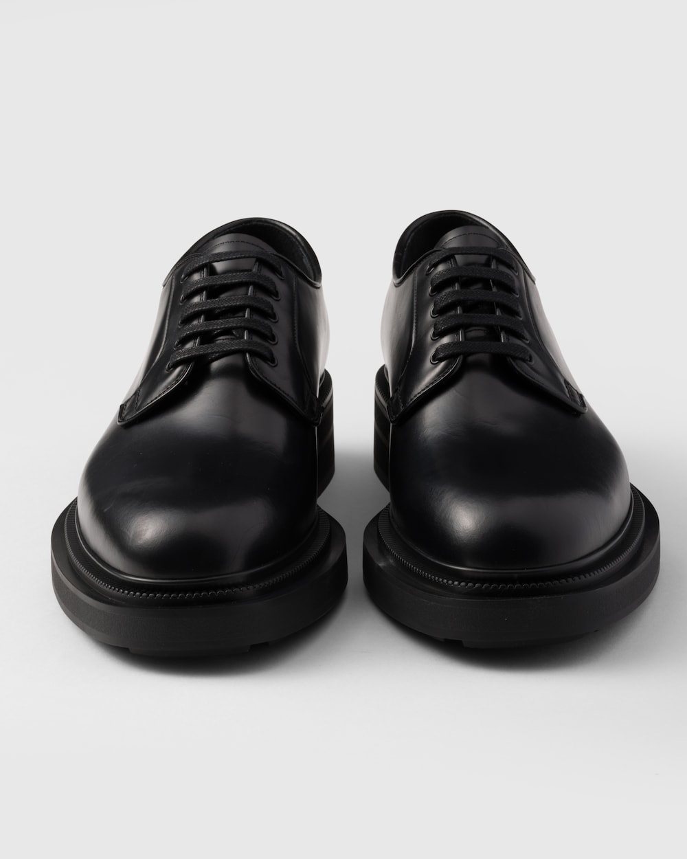 現代的なエレガンスを湛えるブラッシュドレザー(牛革) レースアップ ダービーシューズ。クラシックなフォーマルシューズのディテールをあしらい、モダンなデザインのラバーソールを合わせています。