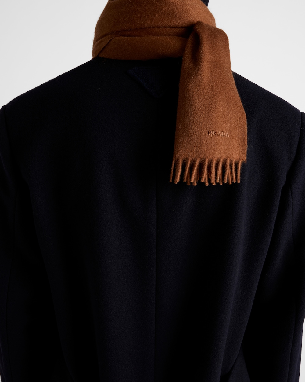カシミヤの柔らかさと上品な印象が洗練されたデザインを引き立てるスカーフ。両端にクラシックなフリンジをあしらっています。同色のレタリングロゴを刺繍したエレガントなアイテム。