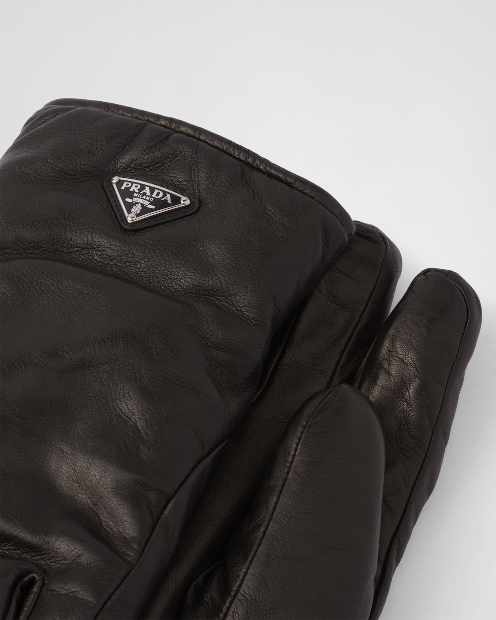 暖かいパイルのライニングを施したナッパレザー(羊革)のグローブ。エレガントな魅力と機能性にあふれるデザイン。アイコニックなエナメルメタルのトライアングルロゴを飾った、洗練されたクラシックなスタイル。