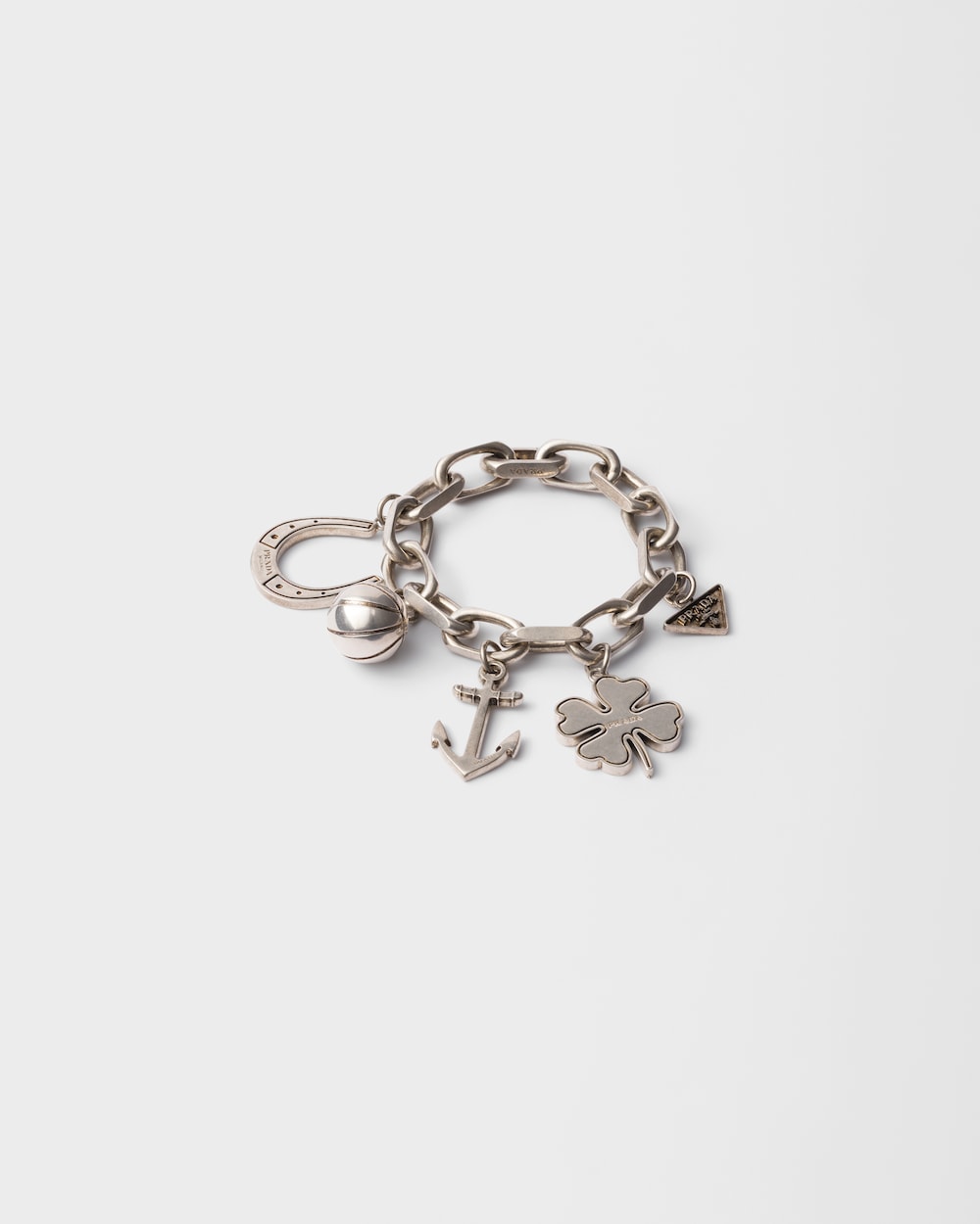 シンボルをお守りや装飾として用いる文化から着想を得た、オリジナルデザインのメタルブレスレット。異なる美的世界を想起させるオーバーサイズのチャームで豊かに装飾された、存在感のあるチェーンが特徴です。アンティーク調のトライアングルロゴがアクセントとなり、ユニークで個性的なアクセサリーとして完成されています。