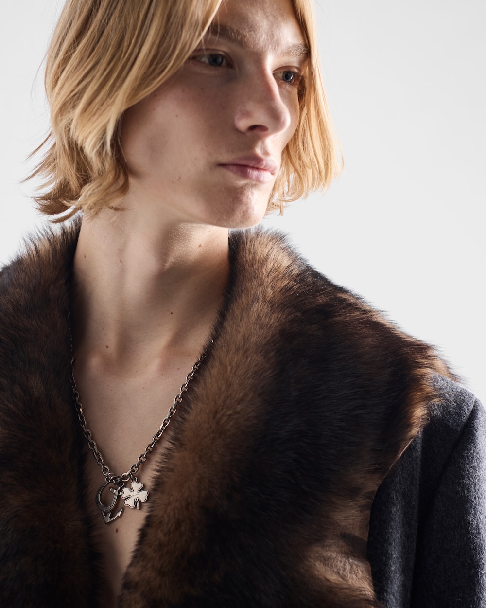シンボルをお守りや装飾として用いる文化からインスピレーションを得た、メタルネックレス。異なる美的世界を想起させるオーバーサイズのチャームが、ボリューム感のあるチェーンを豊かに彩り、ユニークでアイロニックなデザインを際立たせています。