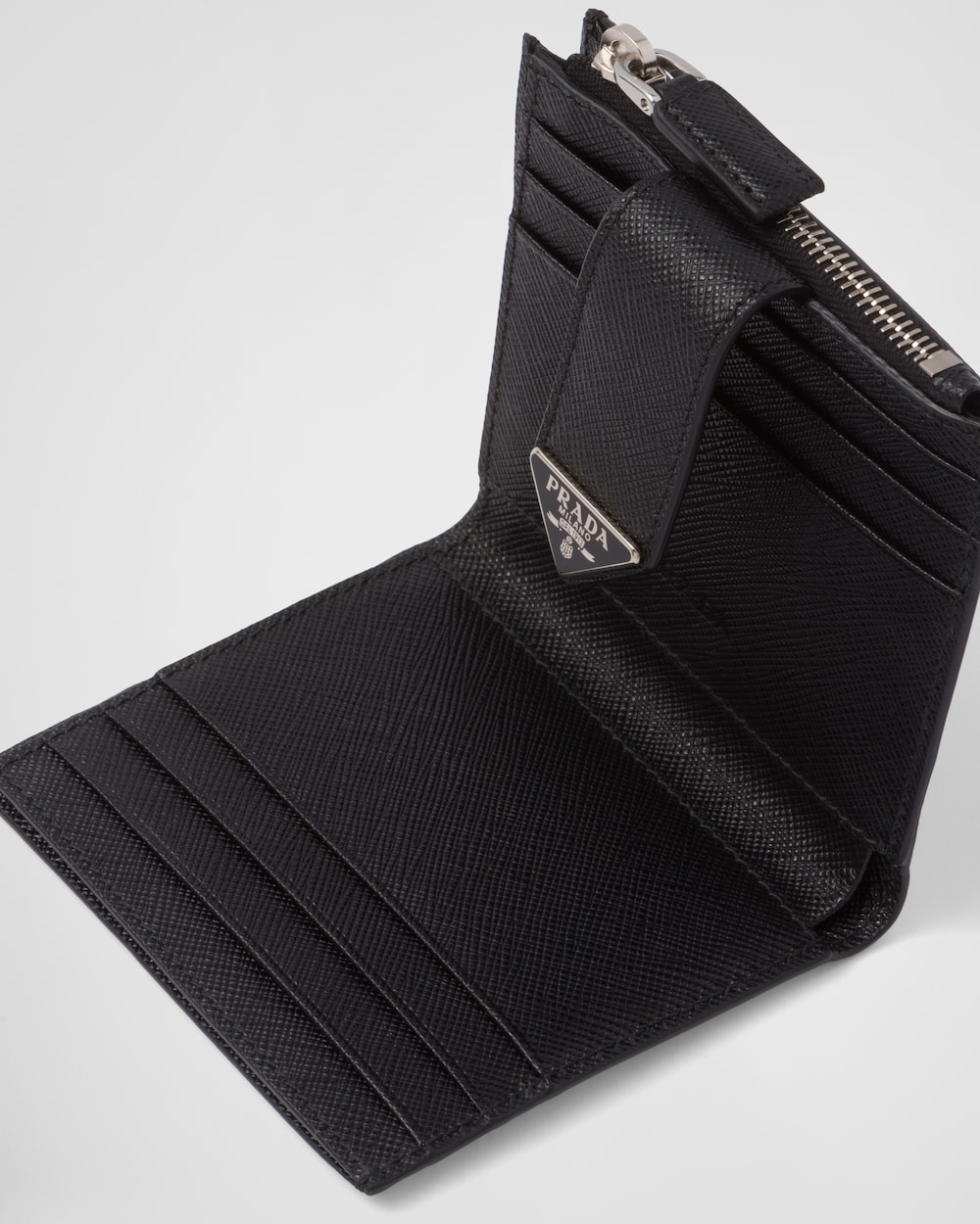 ファスナー付ポケットを1つ、外側と内側にカードホルダーを備えた、すっきりとしたラインのカードケース。創業者のマリオ・プラダが特許を取得した、クロスハッチ加工と優れた耐傷性と多少の水滴にも強いアイコニックな「サフィアーノ」レザーを使用。フロントにエナメル トライアングルロゴを飾りました。