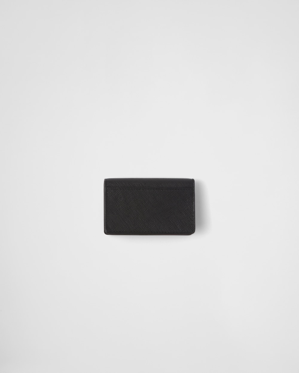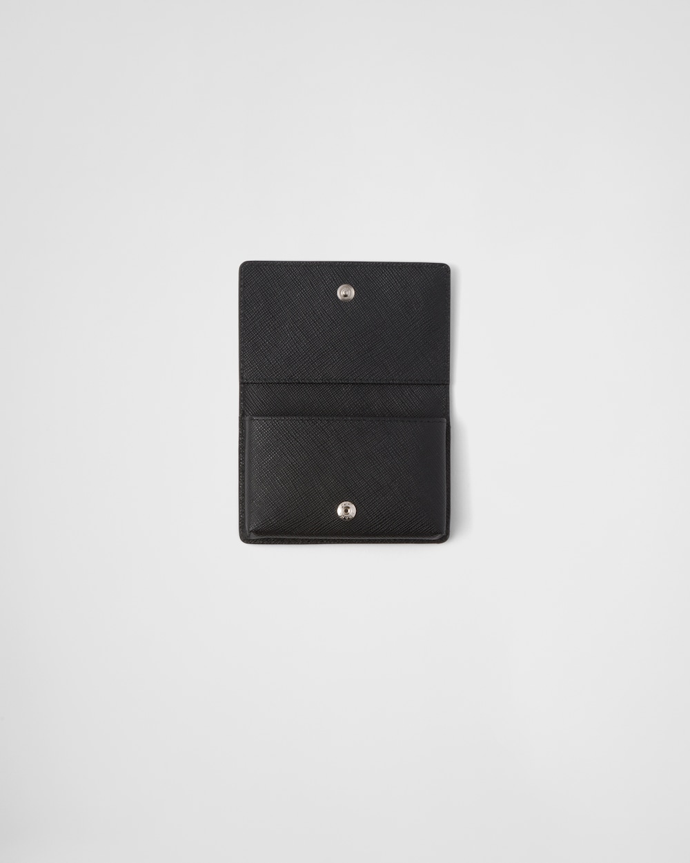 カードホルダー2個を備え、メタルのレタリングロゴをあしらったカードケース。洗練されたデザインが際立つ、使い勝手に優れたアイテム。「サフィアーノ」レザー(牛革)のデザインに、モアレとサフィアーノのライニングを添えました。