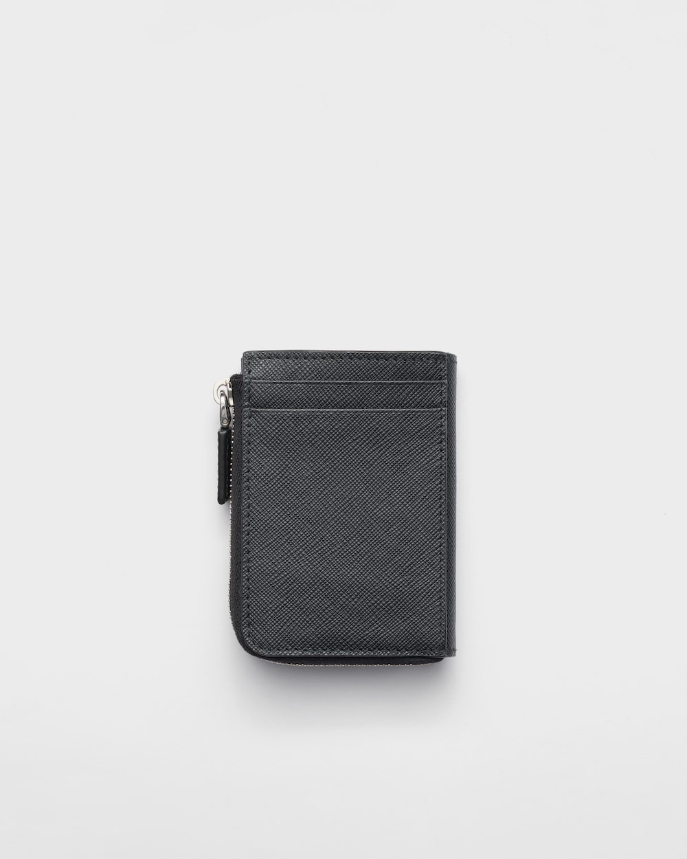 形と機能が相互作用する、洗練されたスタイルのカードケースのデザイン。ファスナー開閉式のコンパクトなシルエットが特徴のサフィアーノレザー(牛革)を使用したアクセサリー。