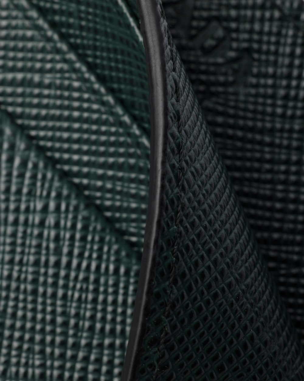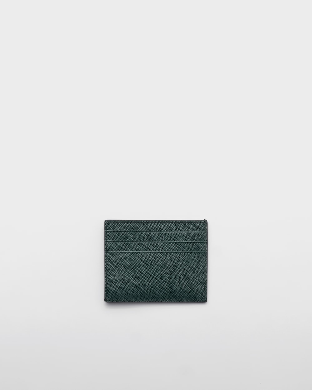 プラダのトライアングルロゴが個性を放つ、「サフィアーノ」カーフ(牛革)のカードケース。カードホルダー6個(表側に3個、裏側に3個)とセンターポケット1個が付いています。