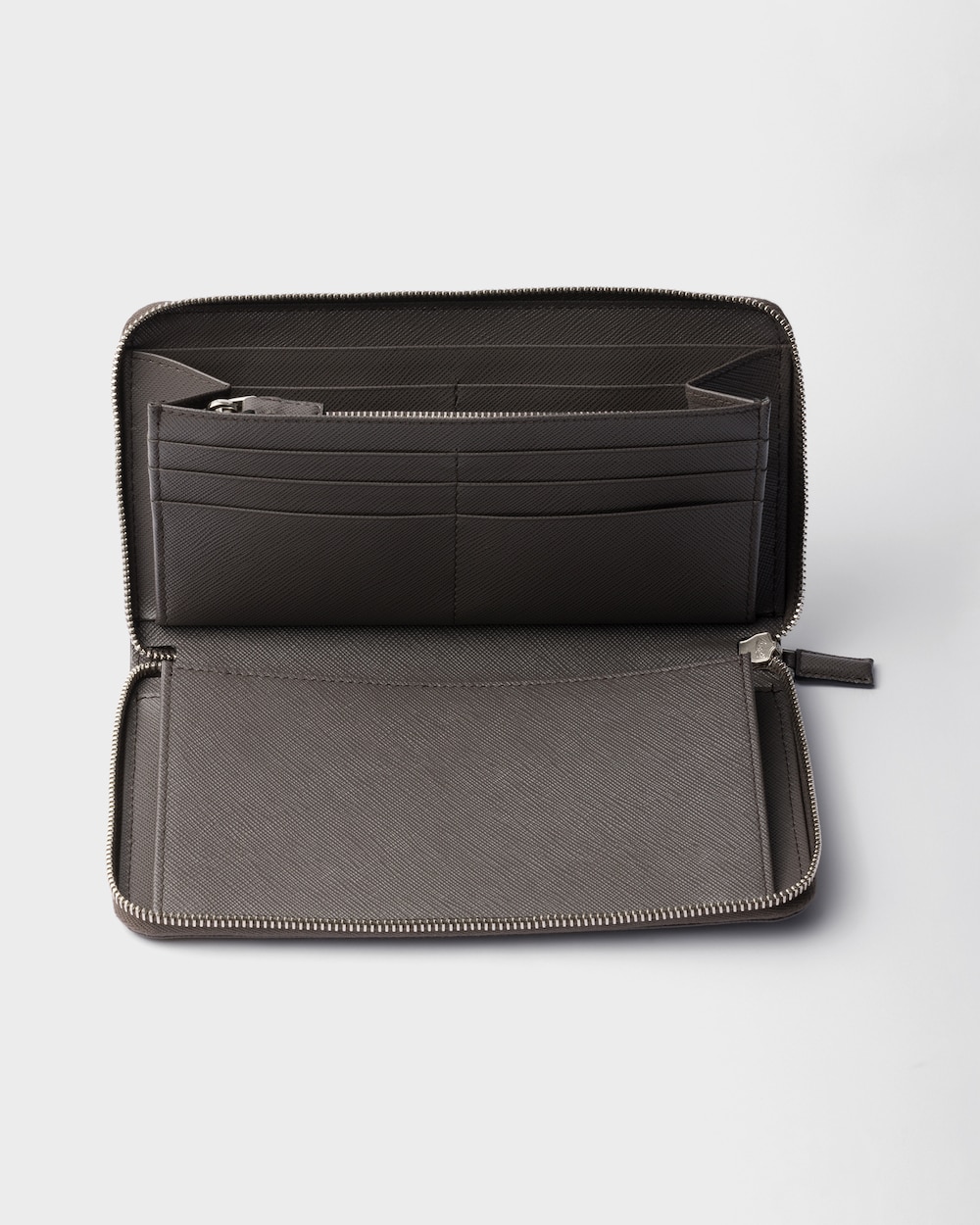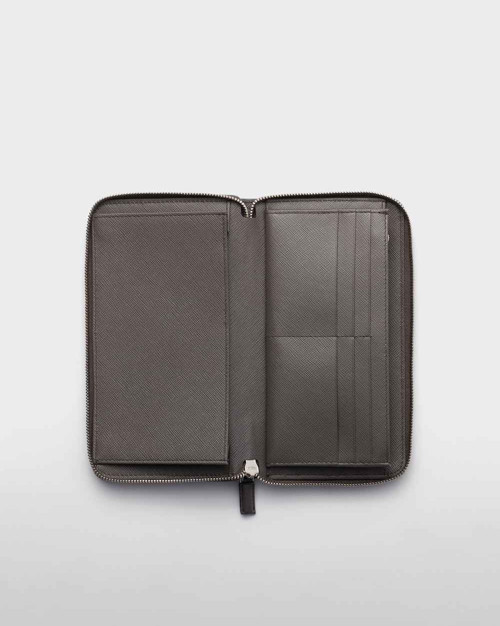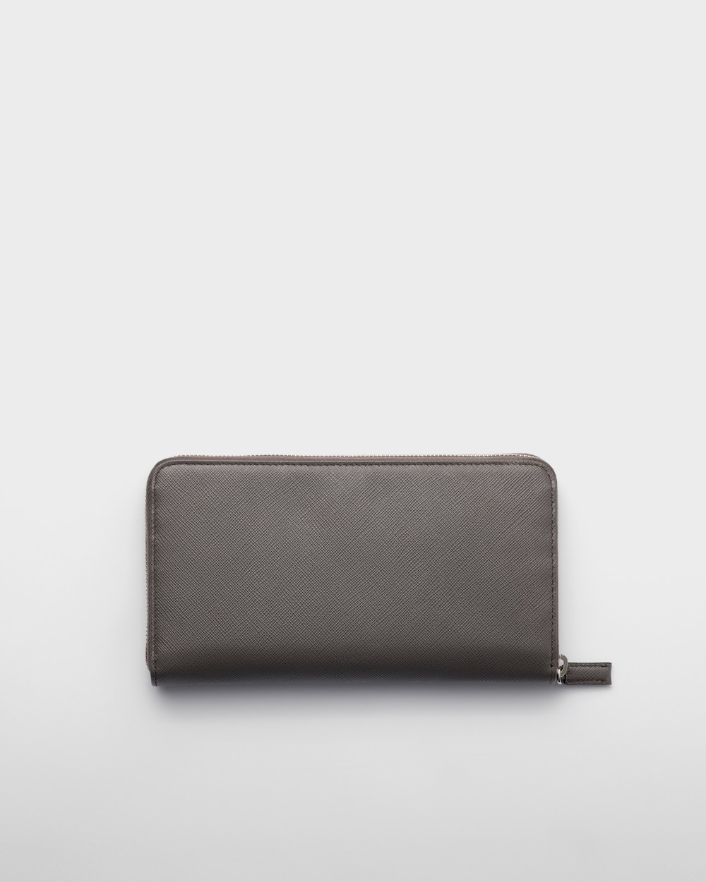 「サフィアーノ」レザー(牛革)を使用したジップアラウンド財布。フロントにエナメル トライアングルロゴをあしらい、3面ファスナーで開閉するデザインです。スタイリッシュなメタルパーツと内側のファブリックライニングが特徴