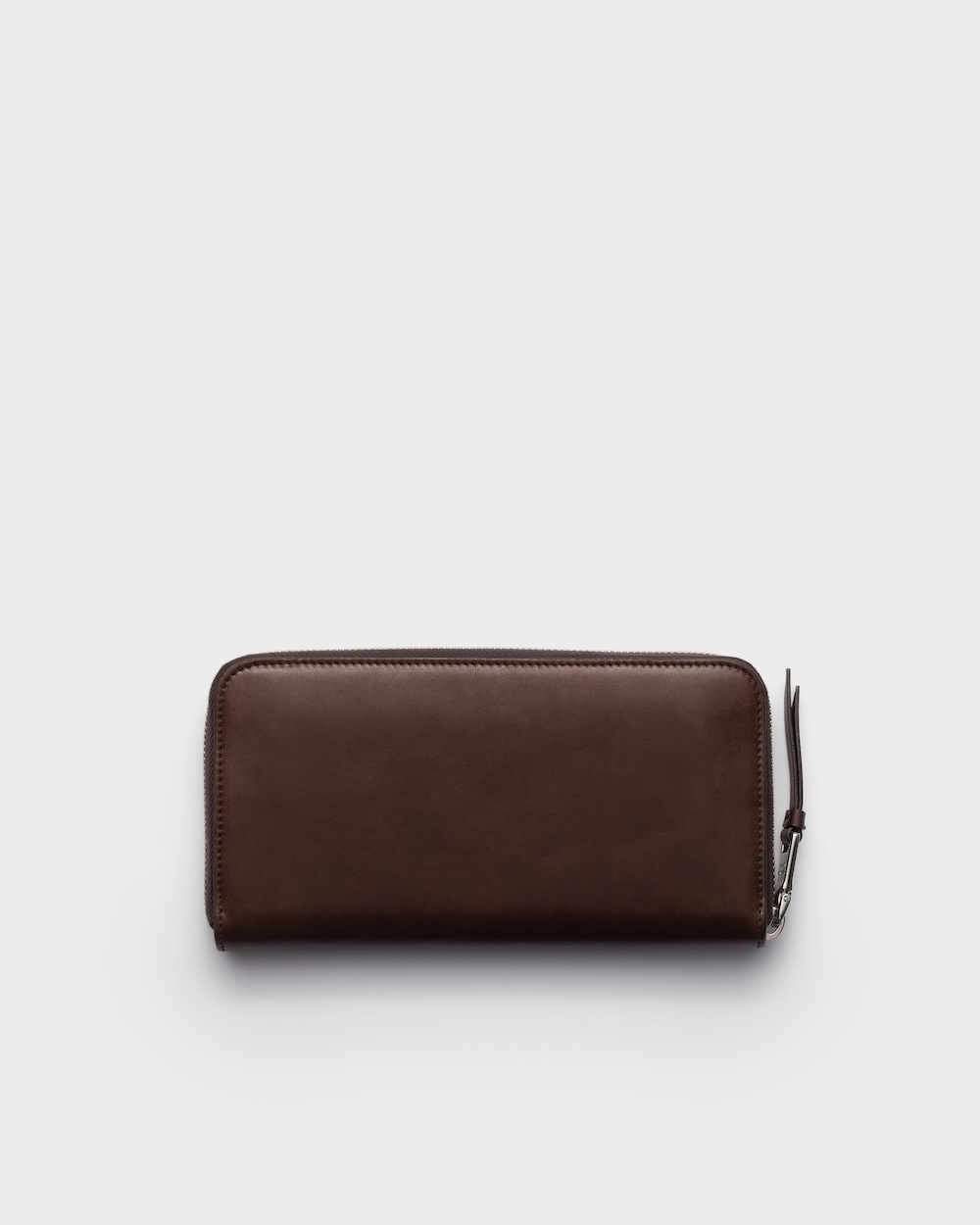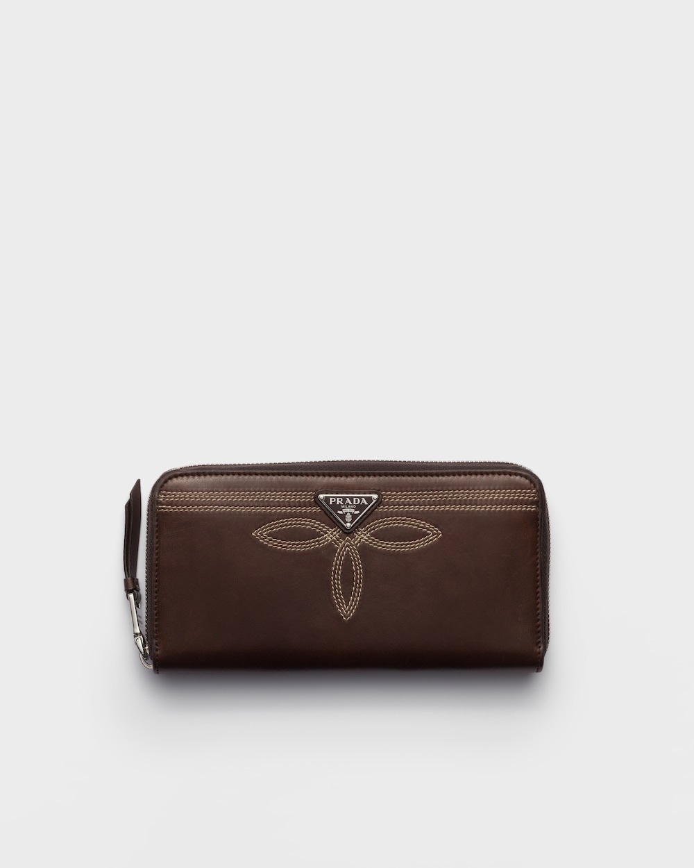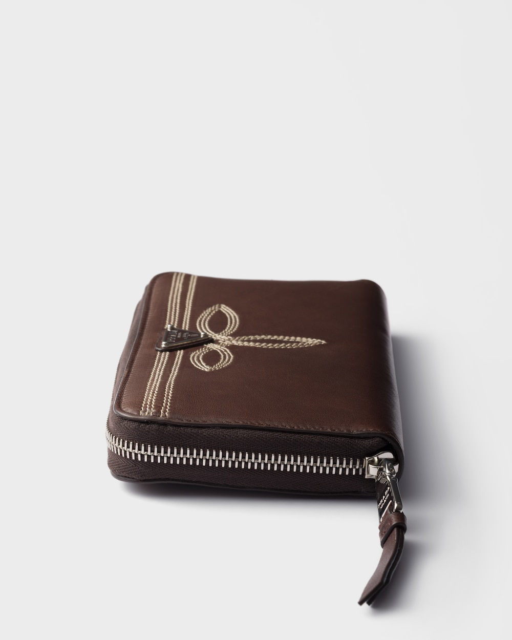 洗練された刺繍モチーフがナッパレザーの財布を彩り、トライアングルロゴが独自のアクセントを添えています。