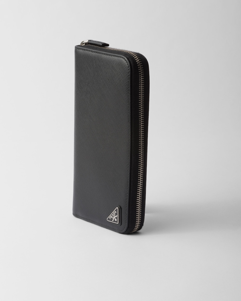 エナメルメタルのトライアングルロゴをあしらった、エレガントな「サフィアーノ」レザー(牛革)のファスナー付財布。内側に収納部分3個、ファスナー付ポケット1個、カードホルダー12個を備えています。