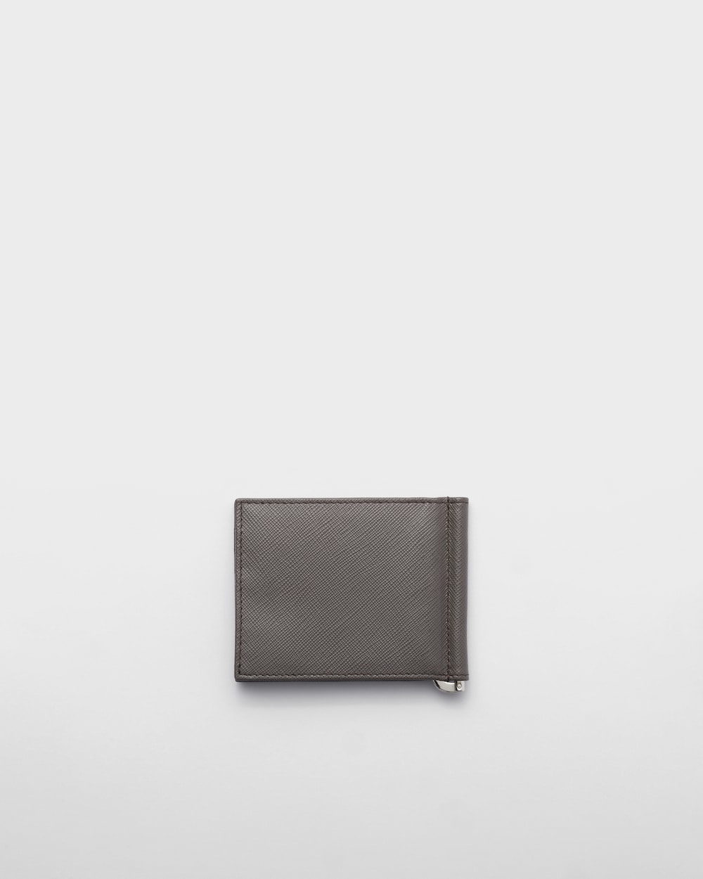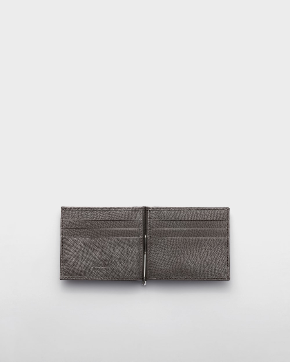 PRADAのトライアングルロゴをあしらった、エレガントな「サフィアーノ」レザーの2つ折り財布。表面のレザーと同じ色合いで統一した内側には、メタルのマネークリップ1個とカードホルダー6個を備えています。