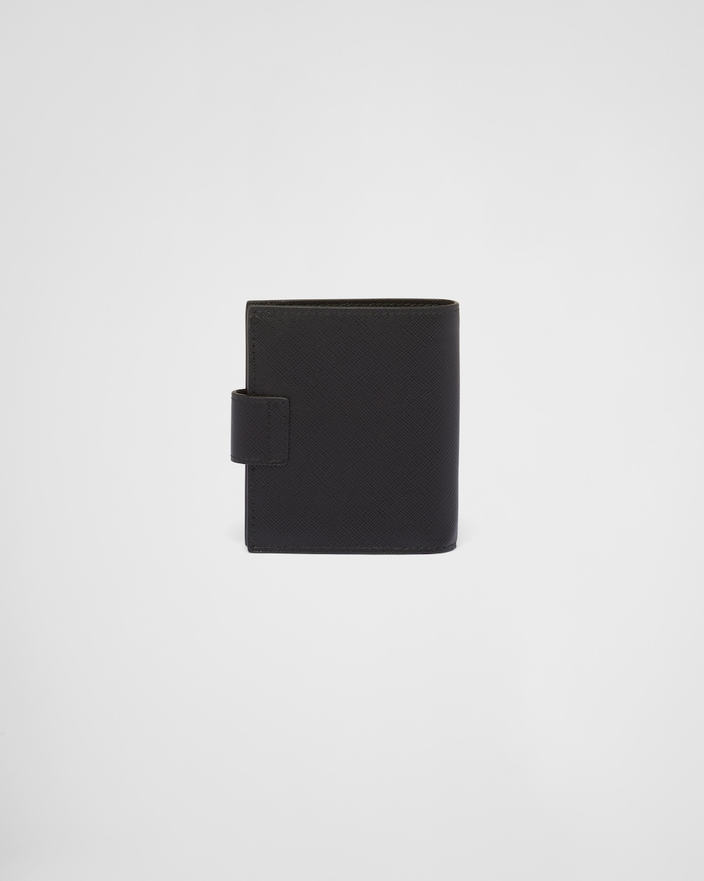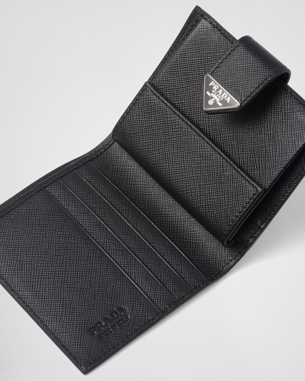 プラダを象徴する素材「サフィアーノ」レザー(牛革)を使用した財布。札入れ、カードホルダー、小銭入れなどのポケットや収納部分を備え、モアレと「サフィアーノ」レザー(牛革)のライニング、エナメルメタルのトライアングルロゴをあしらいました。