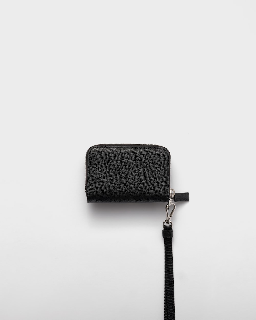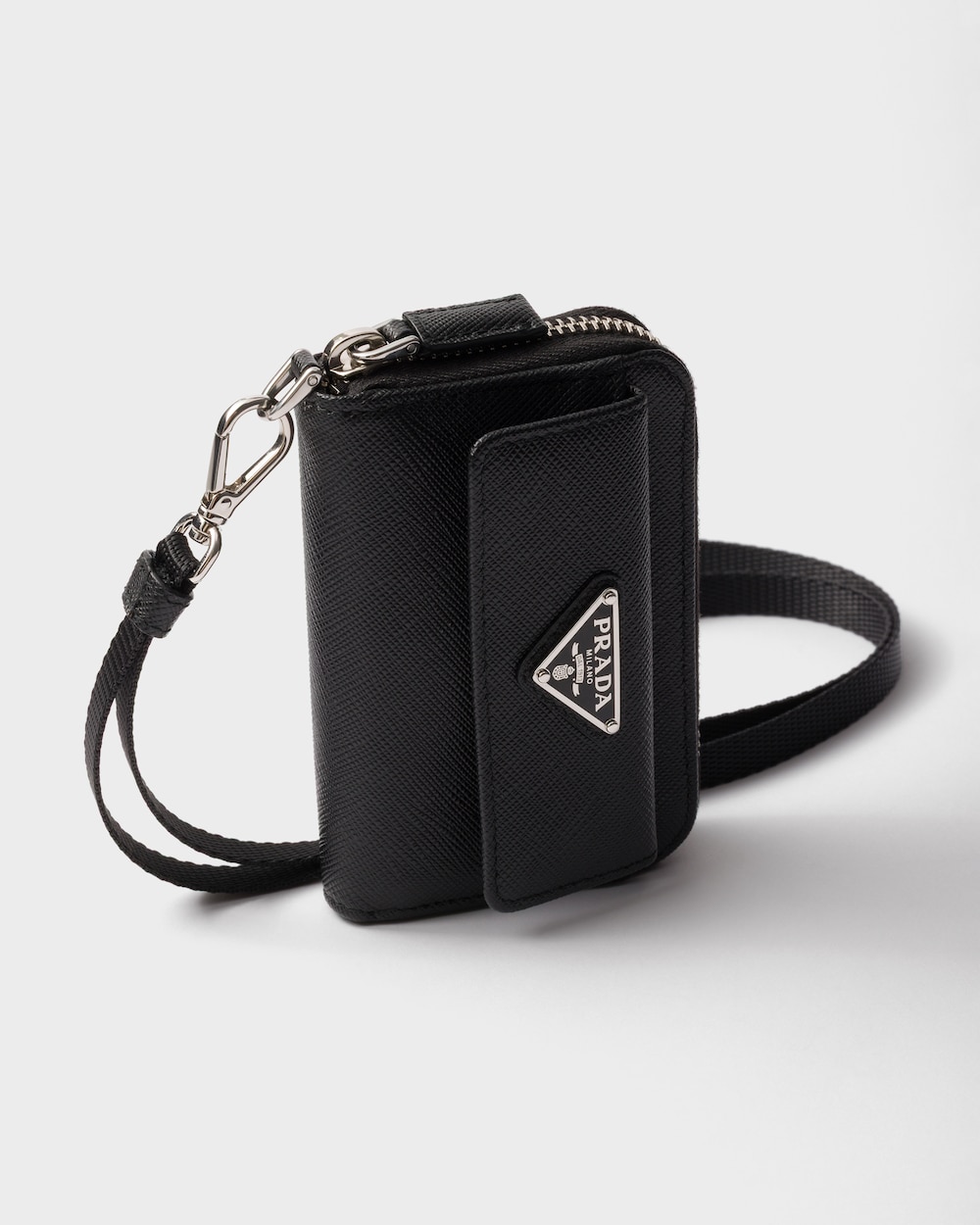 「サフィアーノ」レザー(牛革)のコインケース。内ポケット1個とカードホルダー2個を配した実用的で洗練されたデザイン。便利なネックストラップを備え、エナメルメタルのトライアングルロゴをあしらっています。