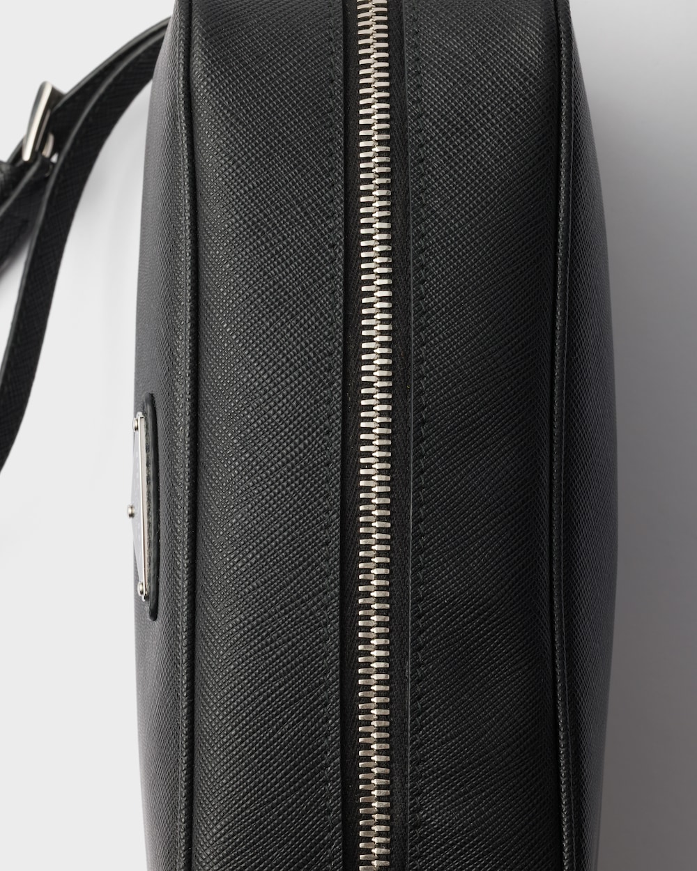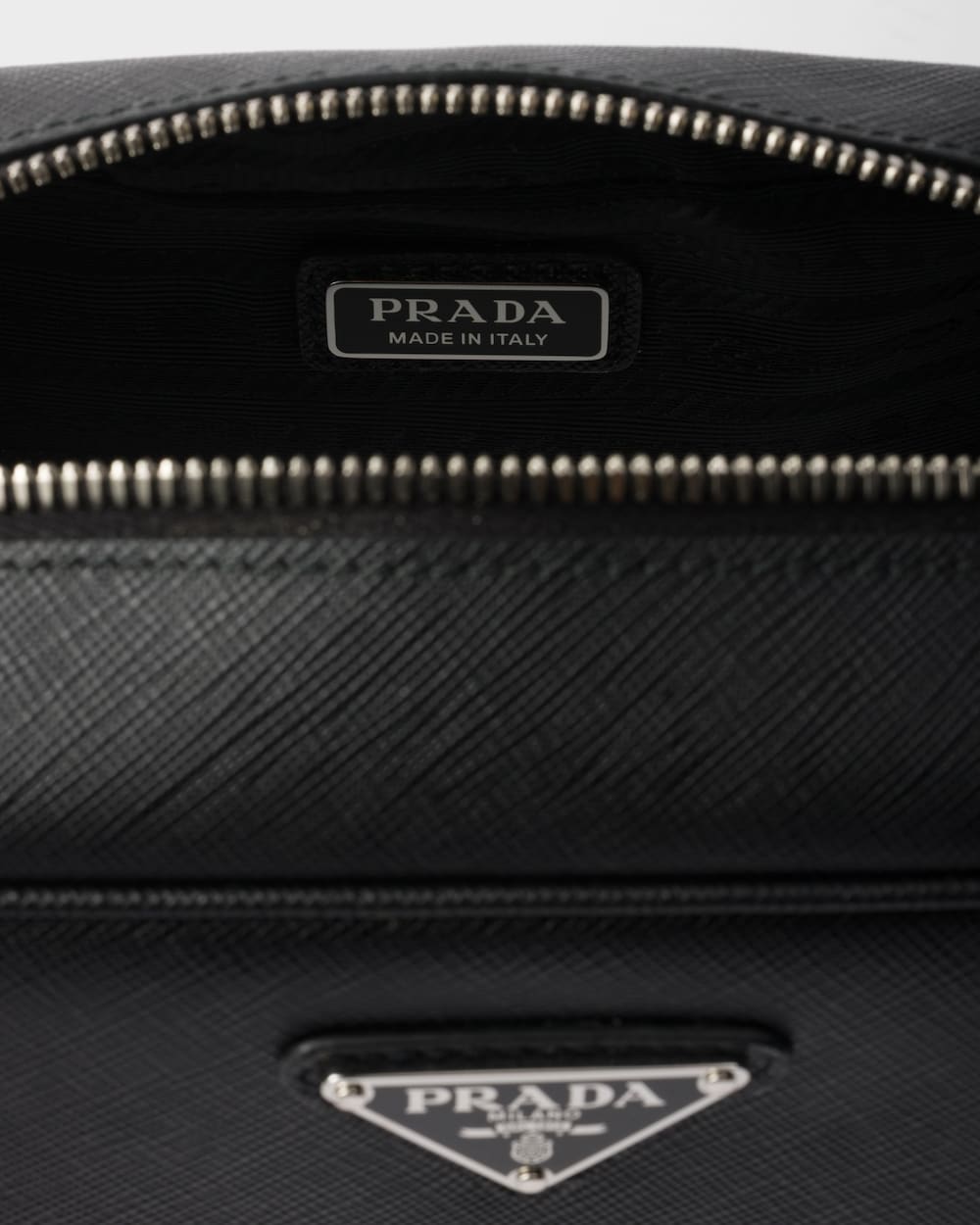 プラダを象徴する素材「サフィアーノ」レザー(牛革)は、クロスハッチ加工とワックス仕上げの質感が特徴で、このポーチにエレガントで多用途なスタイルを与えています。取り外し可能なリストストラップ付のアクセサリーには、エナメルメタル トライアングル ロゴがあしらわれています。