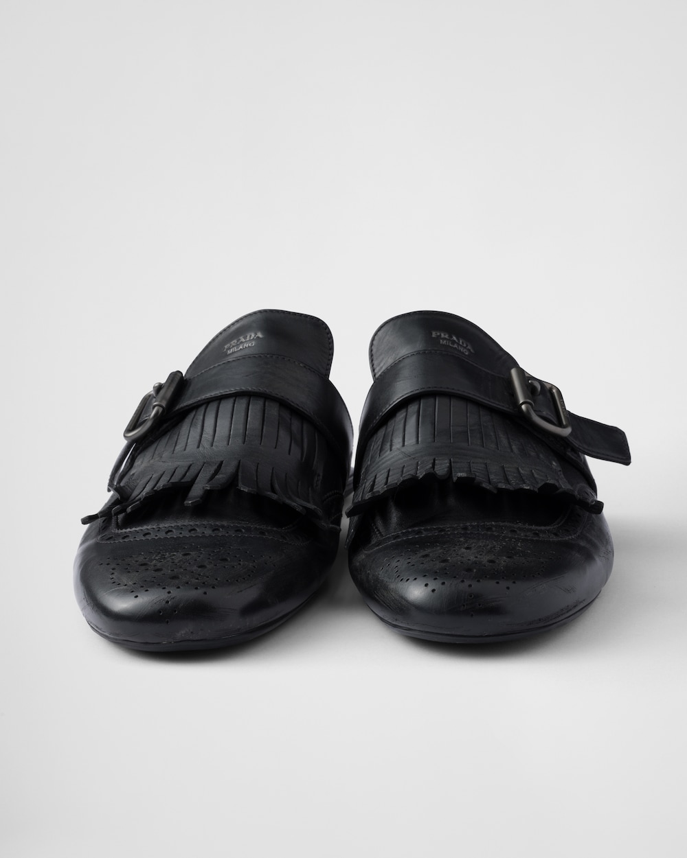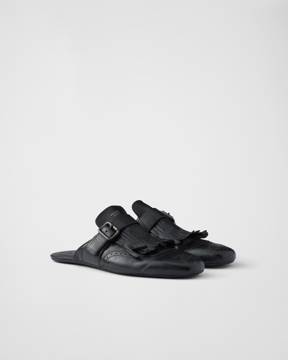 クラシックなスタイルを再解釈した、柔らかく柔軟なデコンストラクテッドデザインのミュール。洗練されたパンチング加工のブローグモチーフ、伝統的なフリンジ、ヴィンテージ仕上げのレザーが、革新的で現代的なシルエットと、さりげなく遊び心のあるコントラストを成しています。