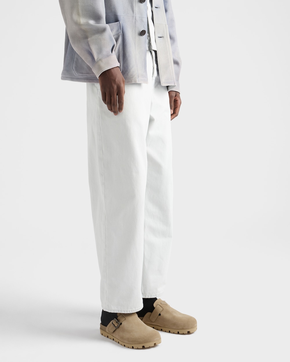 カジュアルな洗練と快適さが特徴のミュール。スエードのアッパーにサイドストラップとバックルが装飾されています。ラバーソールが、エナメルメタルのトライアングルロゴで装飾された軽量で多用途なシューズを完成させます。