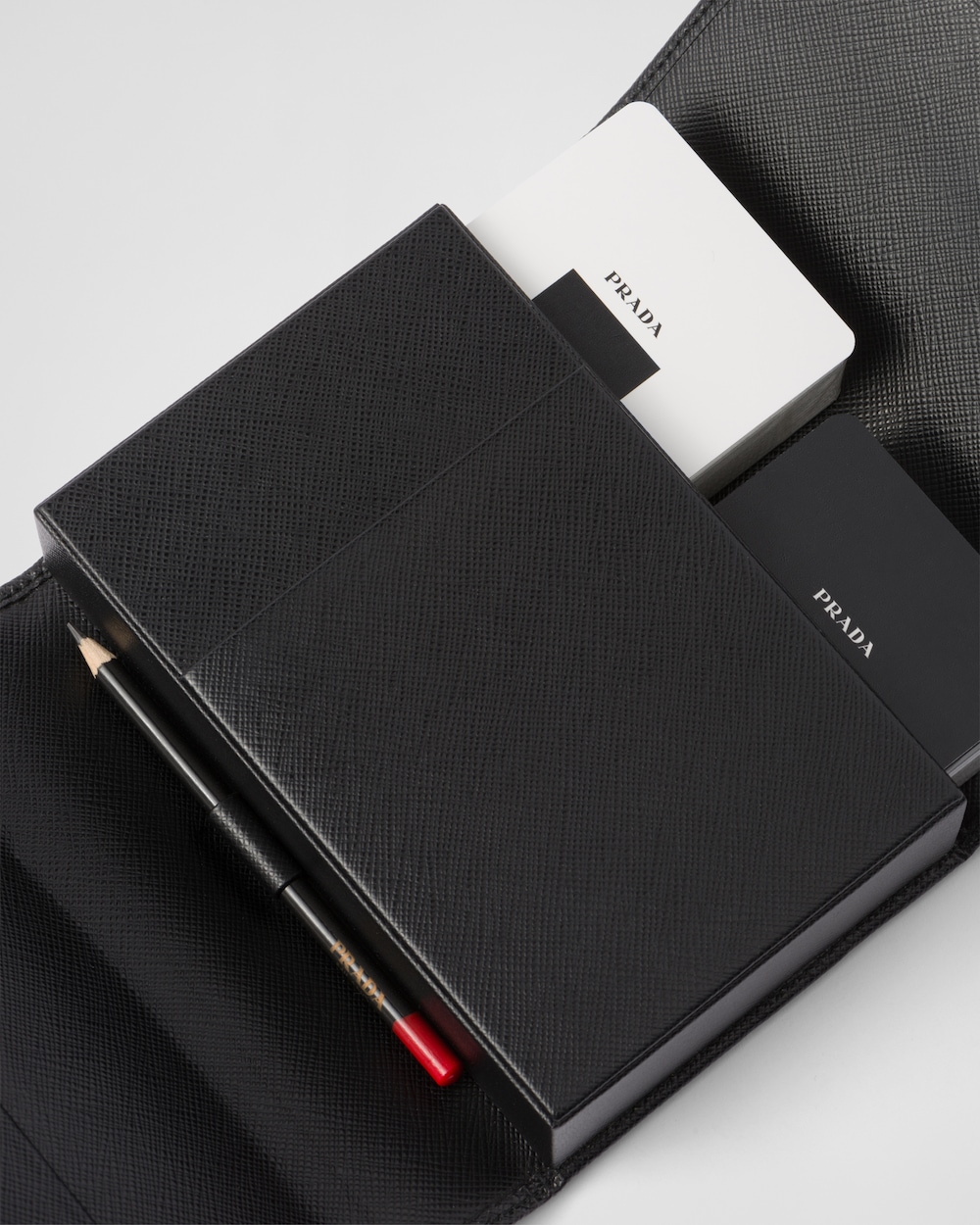 プラダを象徴する素材である「サフィアーノ」レザーを使用した贅沢なケースに入ったトランプカード2組セット。クロスハッチの質感とワックス仕上げが特徴の高品質のカーフレザー(牛革)です。エナメルメタルのトライアングルロゴをあしらいました。