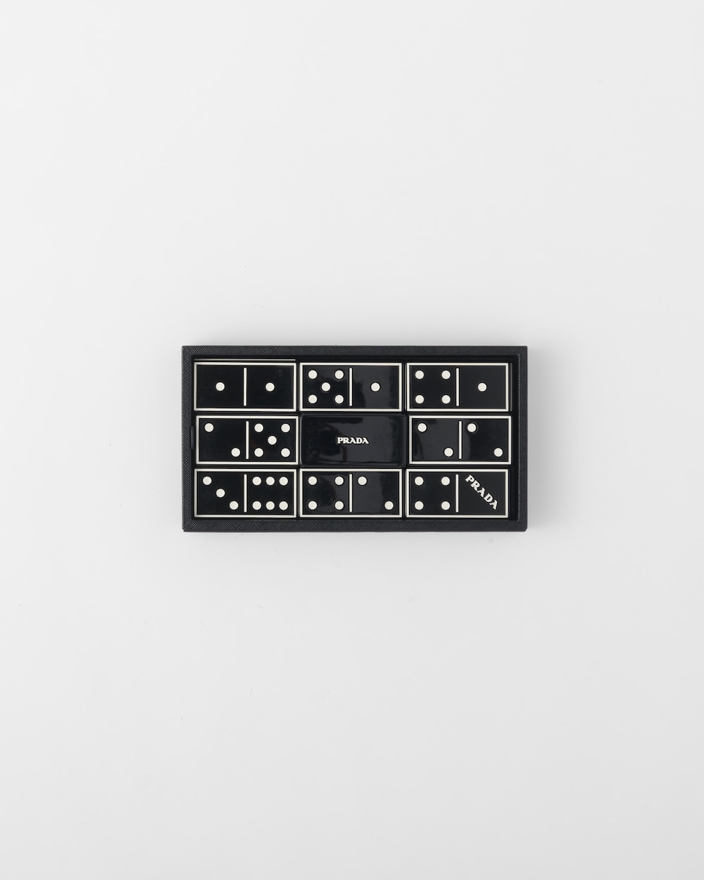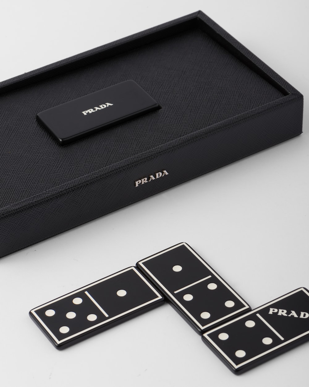 洗練された「サフィアーノ」レザー(牛革)ケースとレタリングロゴ入りのエレガントなドミノセット。