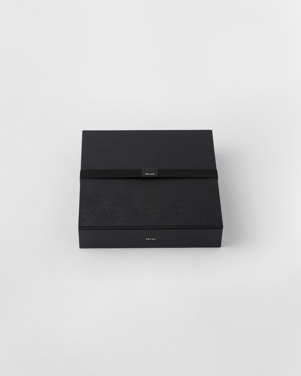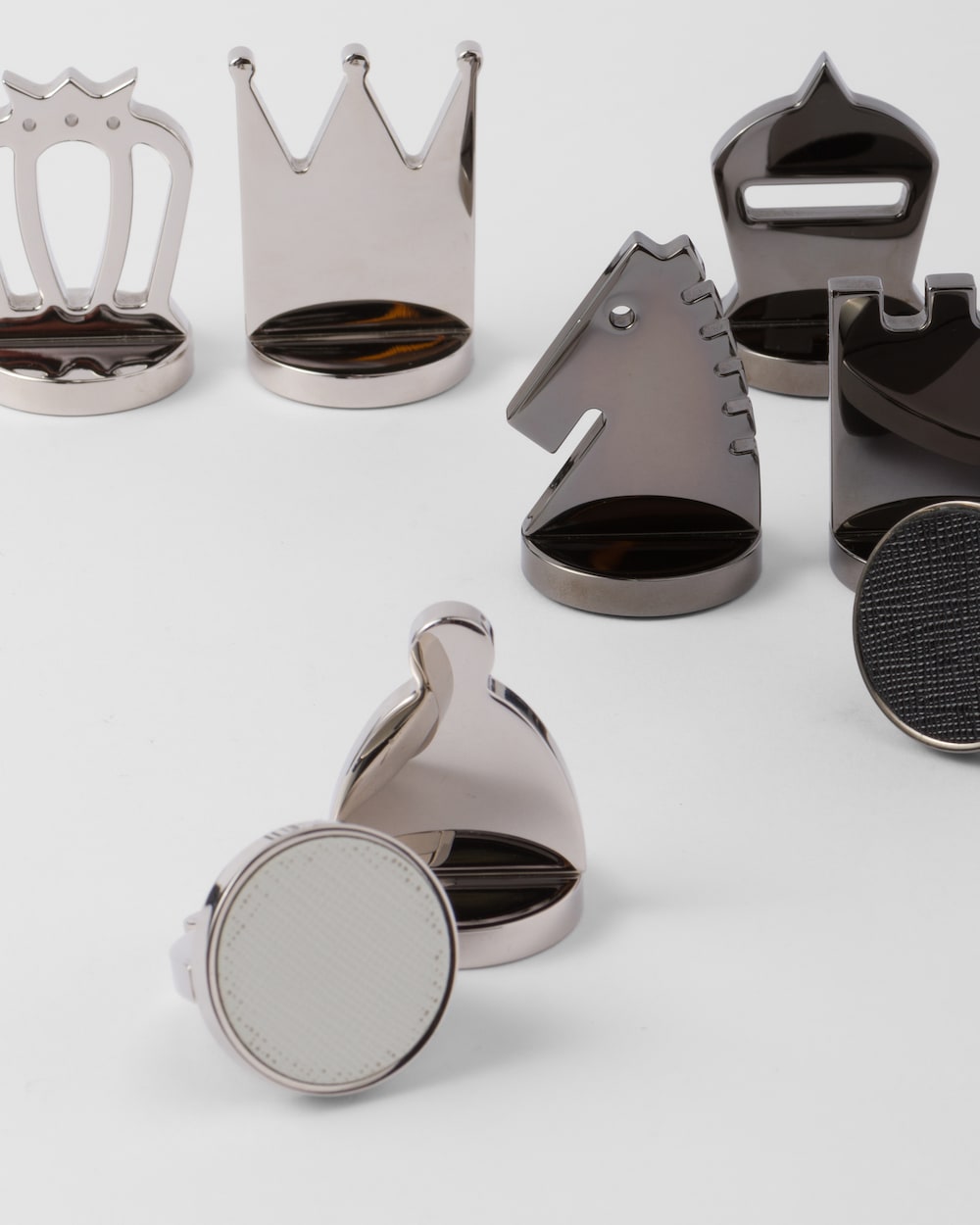 エレガントな「サフィアーノ」レザーのボックスにメタルのこまを収納したエレガントなチェスセット。