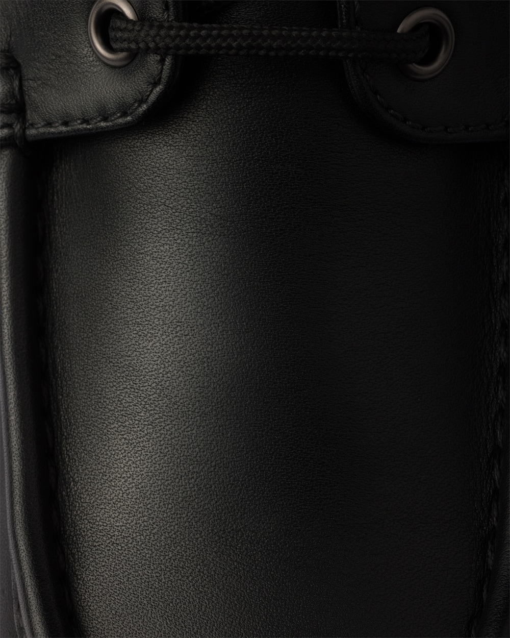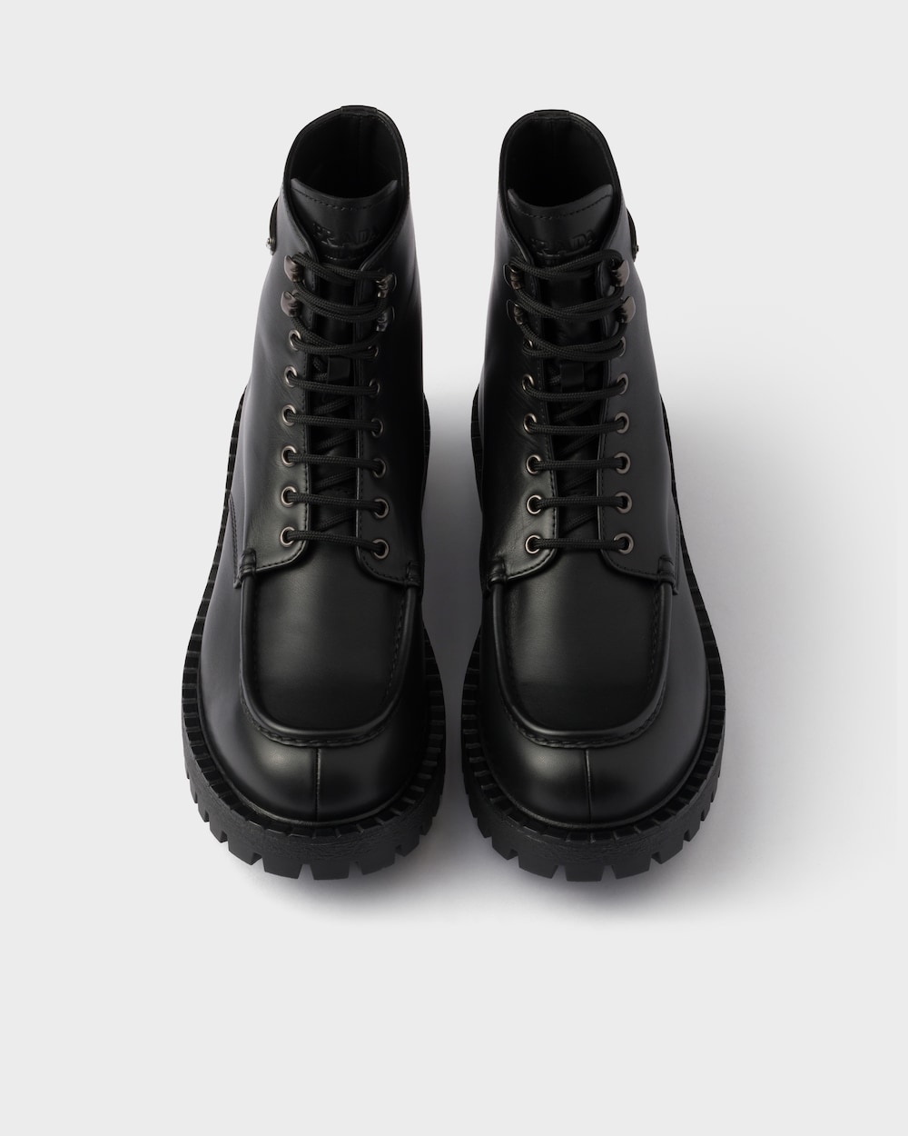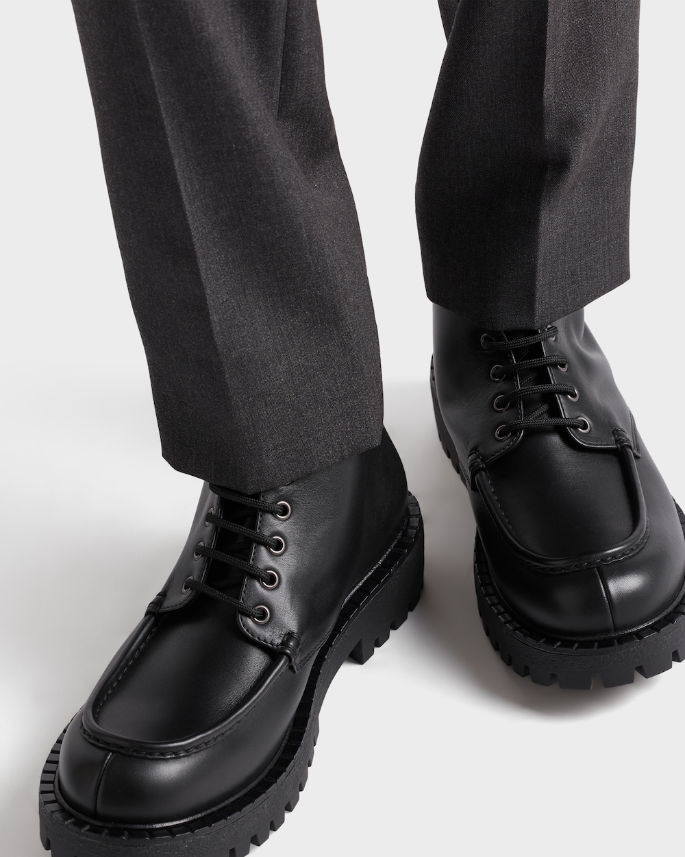 このブーティーは、クラシックなハイキングブーツを再解釈したもので、洗練されたディテールが特徴のスポーティなデザインです。耐久性のあるラバーソールを備えたレザーのレースアップシューズには、エナメルメタルトライアングルロゴがあしらわれています。