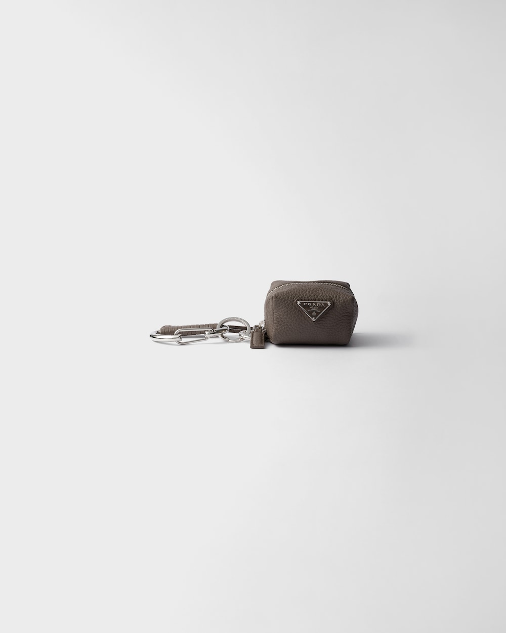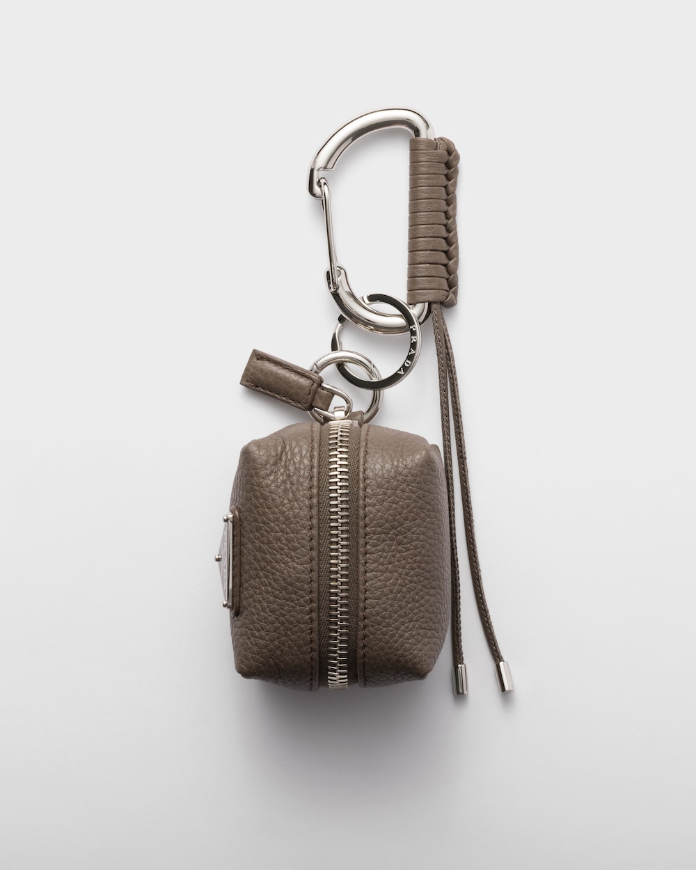 このレザー製バッグチャームは、都会的なスタイルで多機能なデザインです。アイコニックなエナメルメタルトライアングルロゴが、アクセサリーに洗練された印象を加えています。