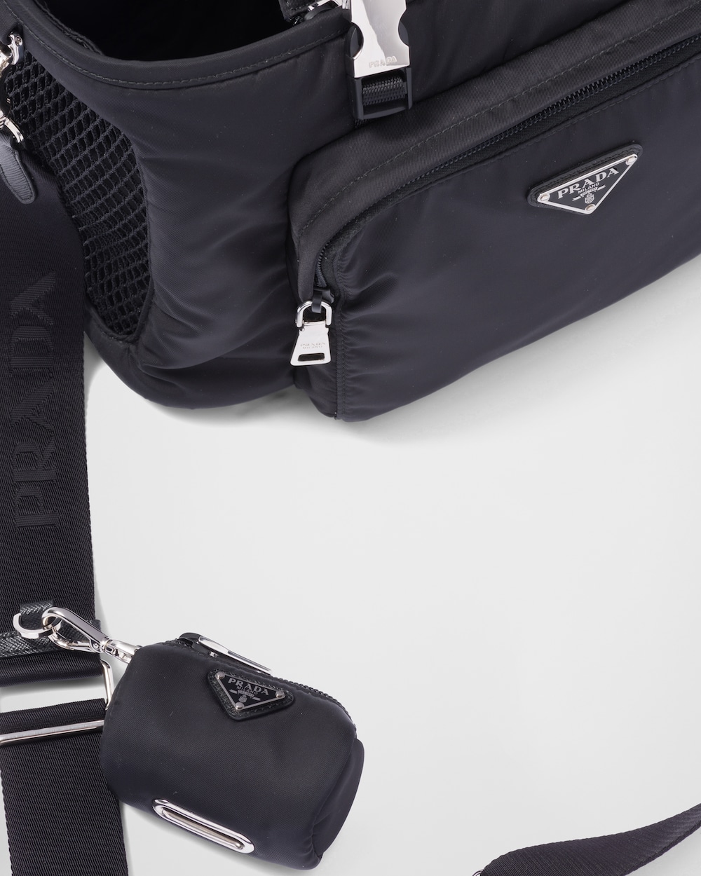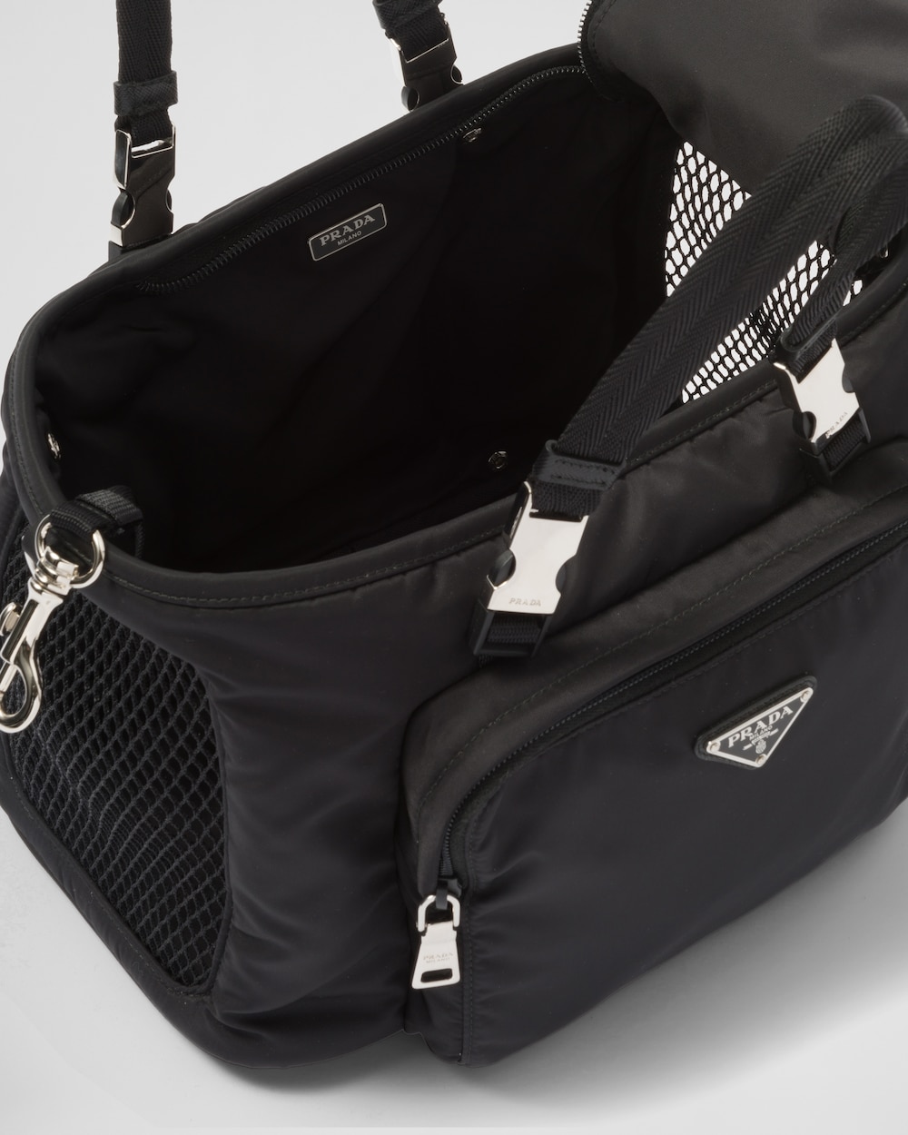 ペットの移動に適したショルダーストラップとダブルハンドル付ペット用バッグ。プラダを象徴する2つの素材、「サフィアーノ」レザー(牛革)とプラダによって初めてラグジュアリーブランドで採用されたナイロンを組み合わせました。アイコニックなトライアングルロゴがあしらわれた、外ポケット付の便利なデザイン。ペットカラー用ストラップ、フードボウル、ペット用トイレ袋ケースなど、ペットのケアに欠かせないアイテムが備わっています。 サスティナブルなお手入れ方法:製品の風合いを保つため、また環境への負荷を軽減するために、製品を頻繁にクリーニングすることを推奨しておりません。使用後は風通しの良い場所で陰干ししていただき、クリーニングが必要な場合は環境に配慮したクリーニング店でドライクリーニングをすることをおすすめします。
