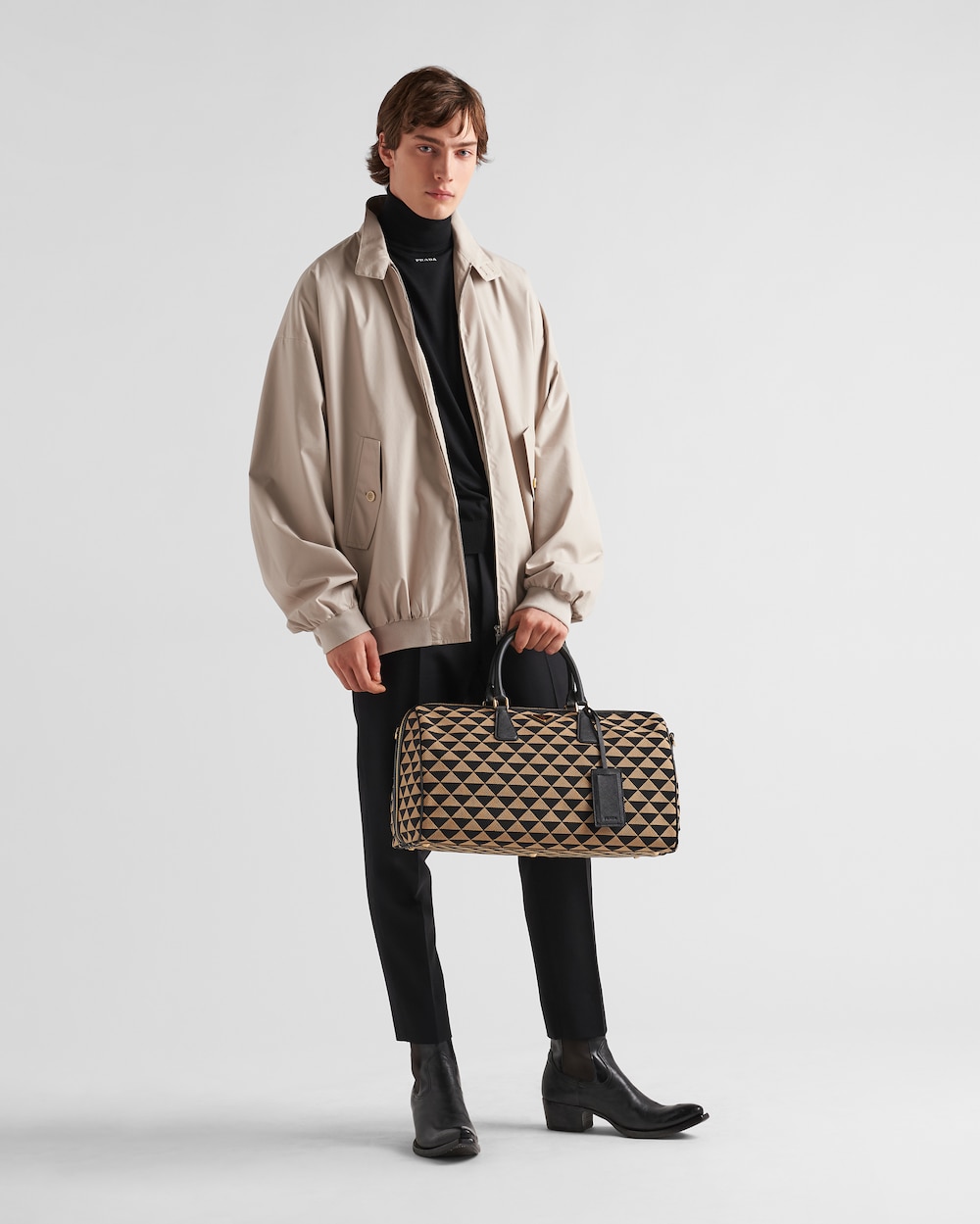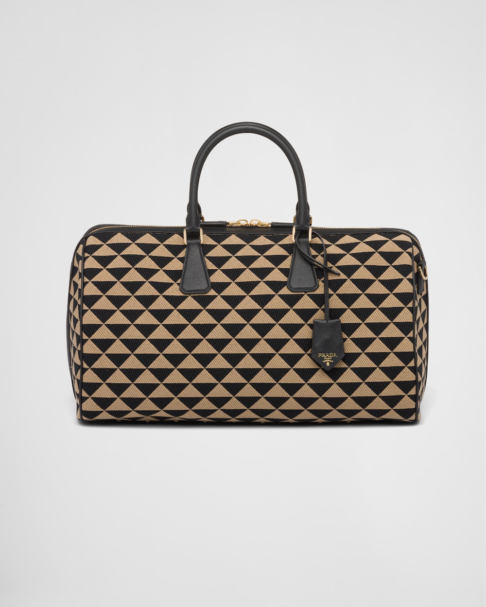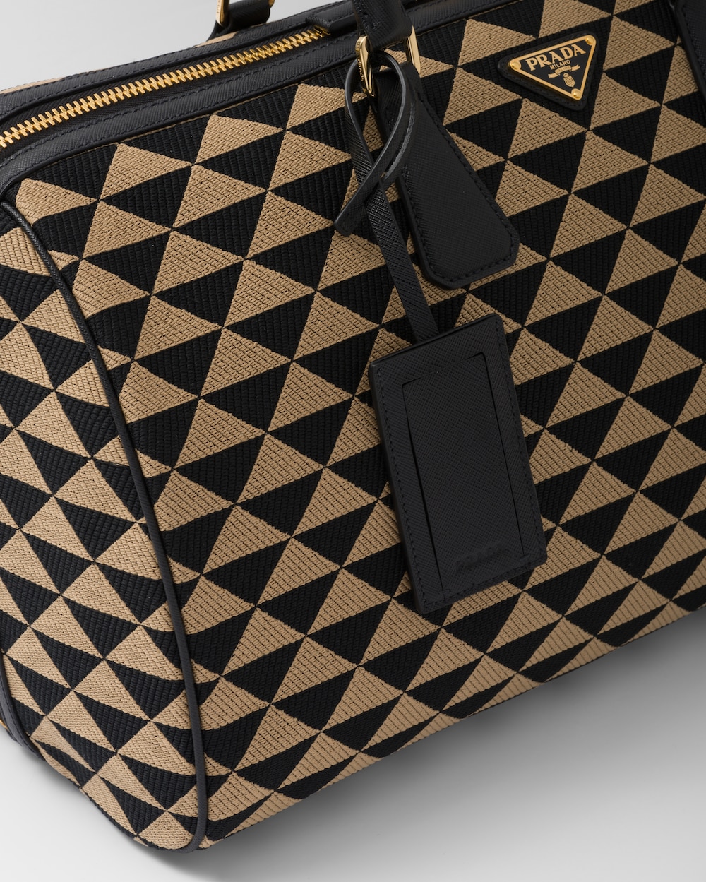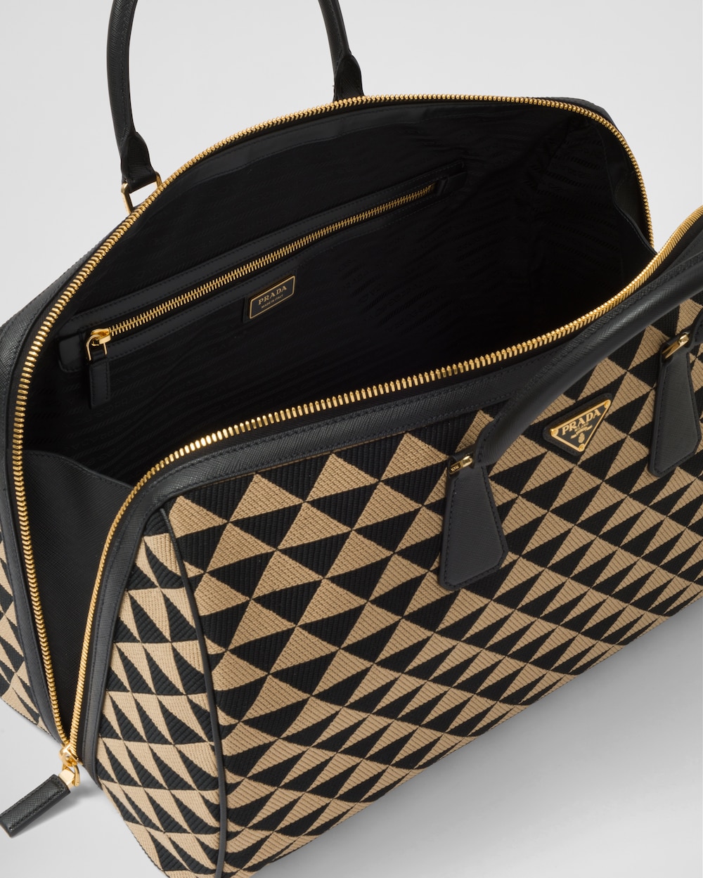 創業者のマリオ・プラダがデザインしたトランクに初めて登場したプラダ トライアングル。独自性とモダニティが表現された普遍的でミニマルなフォルムは、シーズンごとに異なるアレンジで生まれ変わります。その幾何学的なデザインを、上品でありながらモダンなパターンにアレンジしてコントラストを効かせた、刺繍で施したジャカードファブリックのトラベルバッグ。プラダのアイコニックな「サフィアーノ」レザー(牛革)を使用したディテールが際立つデザイン。