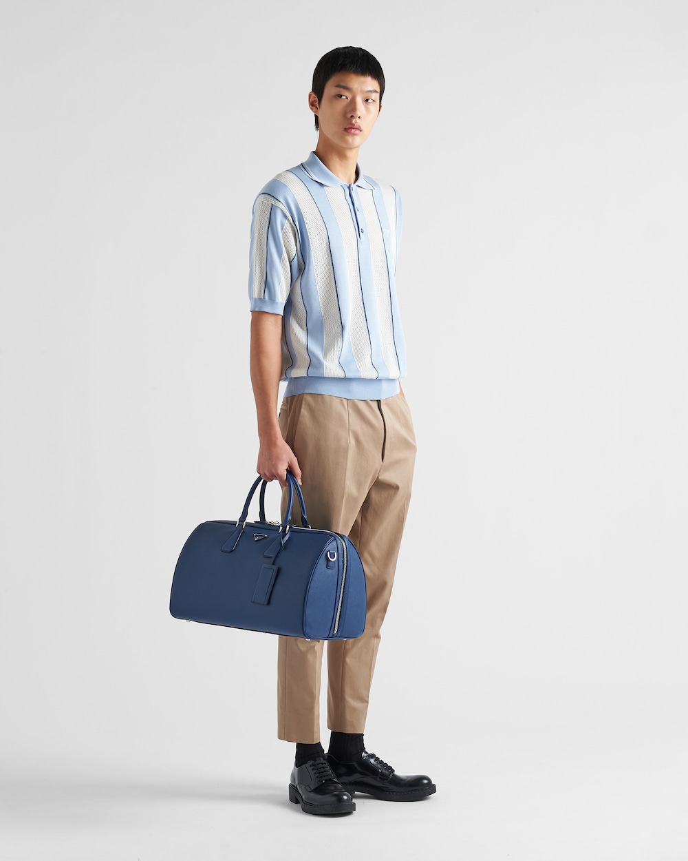 クロスハッチ加工、ワックス仕上げされたアイコニックな素材「サフィアーノ」レザー(牛革)を使用した、エレガントなデザインのトラベルバッグ。実用性の高い取り外し可能なショルダーストラップを備えた洗練されたシルエットに、エナメルメタルのトライアングルロゴがプラダらしい個性的なタッチを添えています。