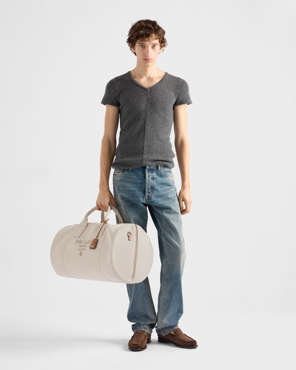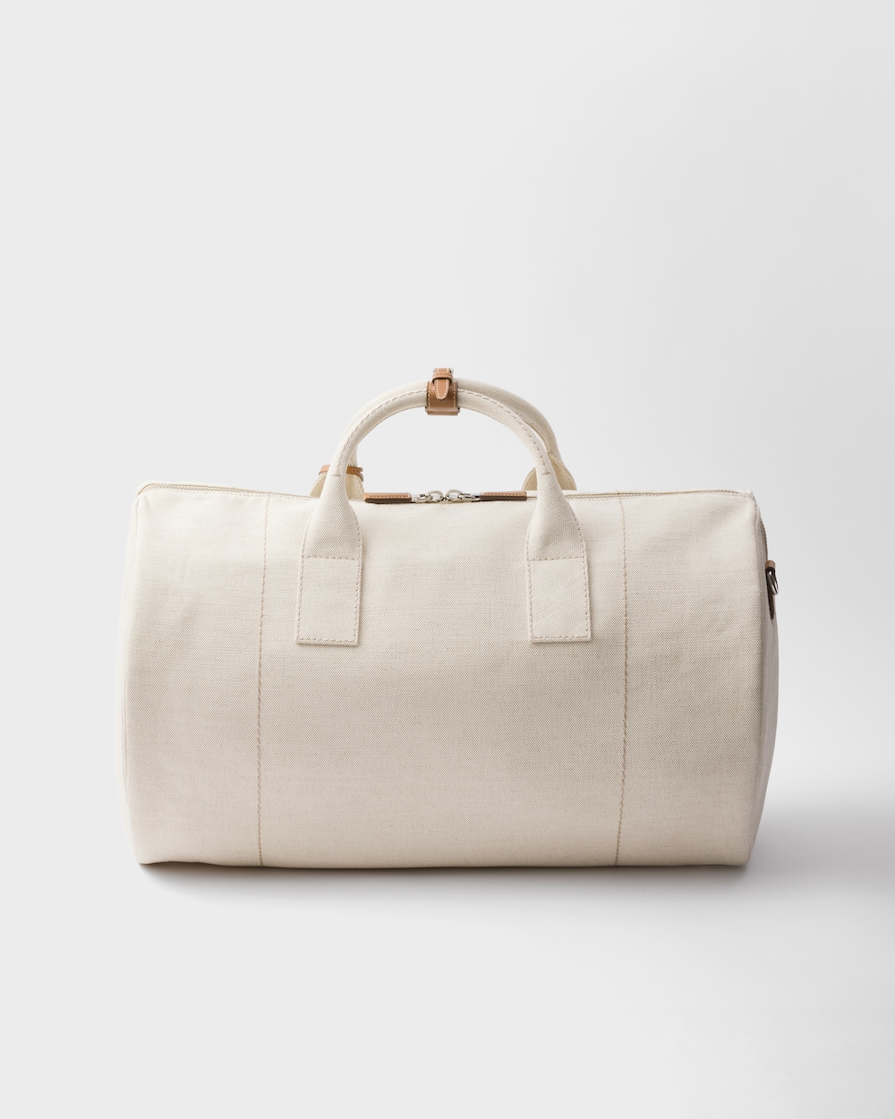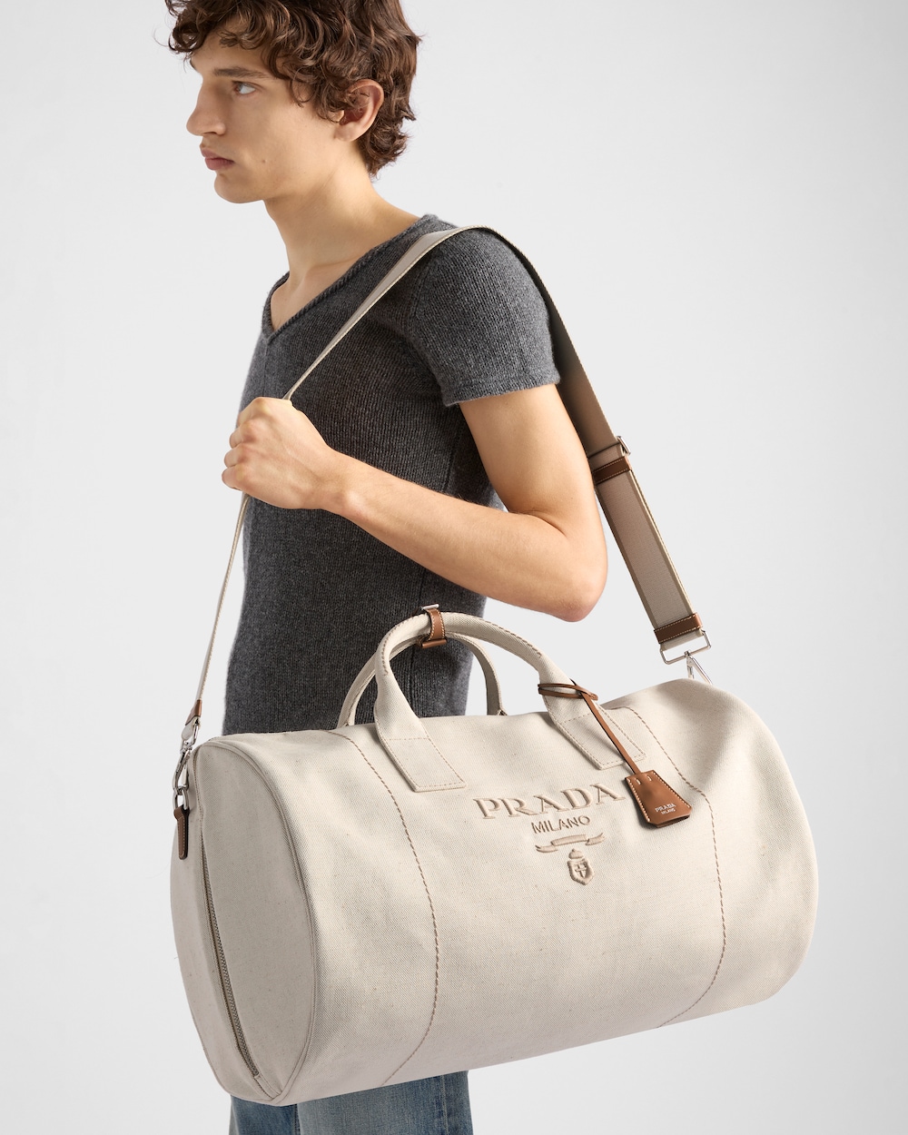 リネンブレンドを使用した軽やかなデザインのダッフルバッグ。スポーティなスタイルを洗練されたレザーのディテールが引き立てています。取り外し可能なショルダーストラップが付いた、汎用性の高い収納力のあるデザイン。同色のロゴ刺繍がプラダらしいアクセントを添えています。